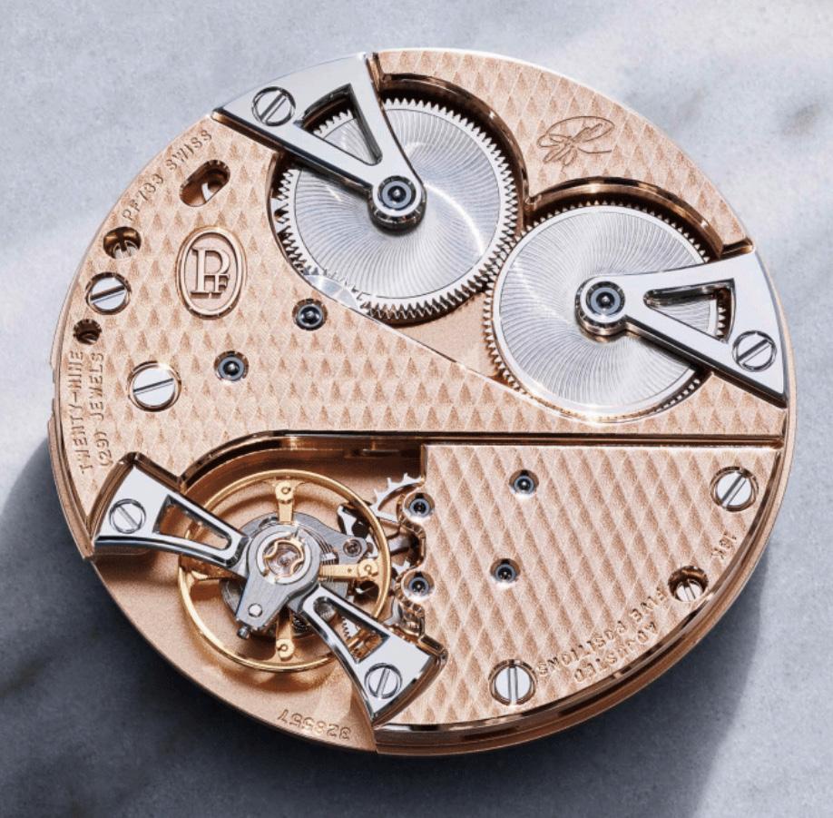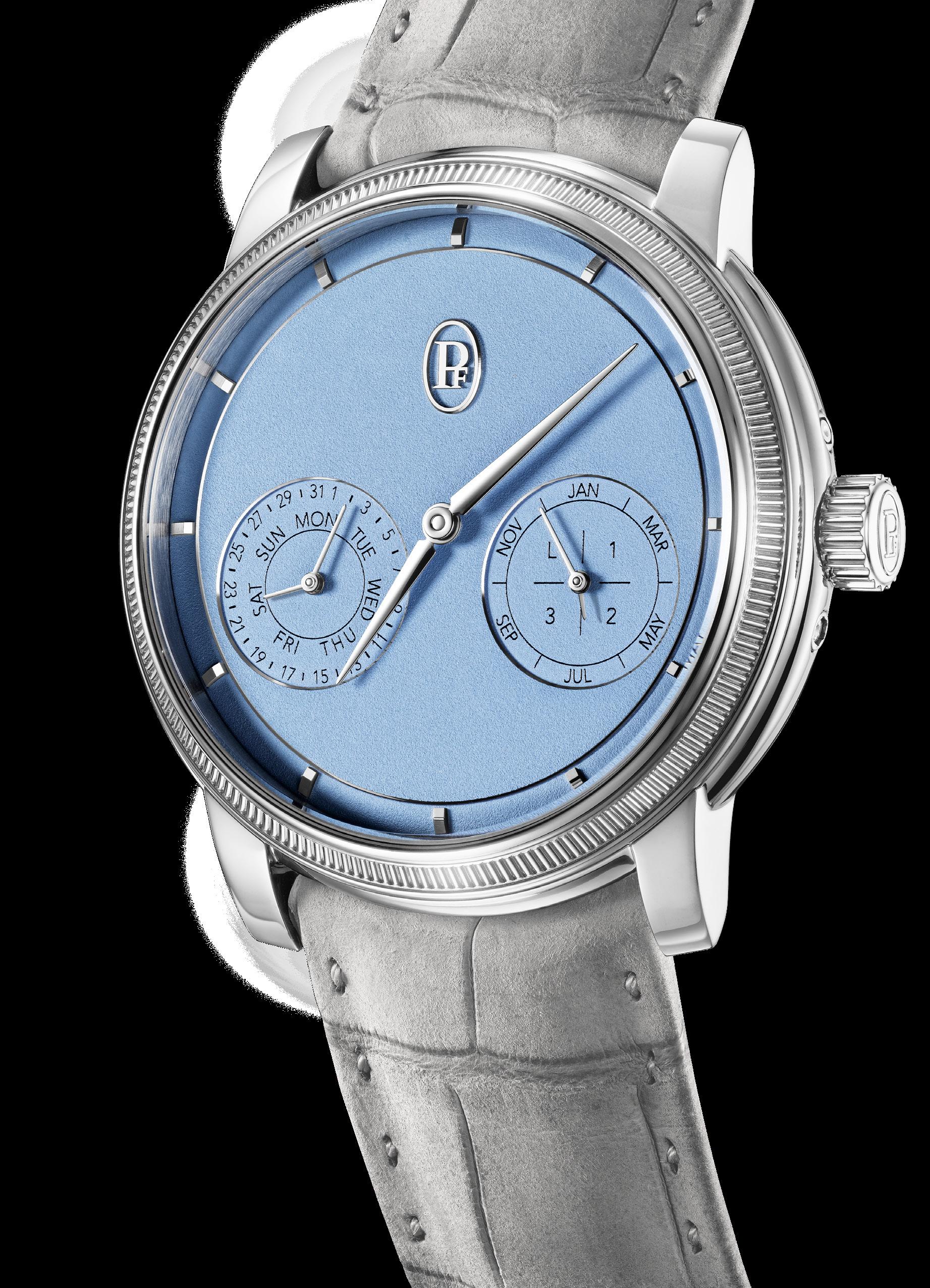 The 40.6 mm case, topped with the iconic gadrooned bezel, exudes measured elegance. At its heart, the manual-winding PF733 caliber in solid gold, extra-flat (5.15mm), exemplifies the coherence between mechanics and philosophy. The Toric Quantième Perpétuel features a dial named Morning Blue. Fresh, matte, subtly grained, it infuses a poetic modernity into a traditionally austere timepiece. This blue, veiled like the first light of day, lends the piece an unprecedented freshness, transforming the dress watch into an object of contemplation. This isn’t a trendy chromatic choice, but a symbolic gesture: this blue speaks of introspection, lightness, and a different way to experience complexity. A rare aesthetic that speaks as much to the eye as to the soul.