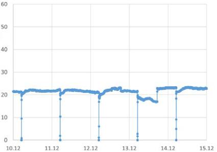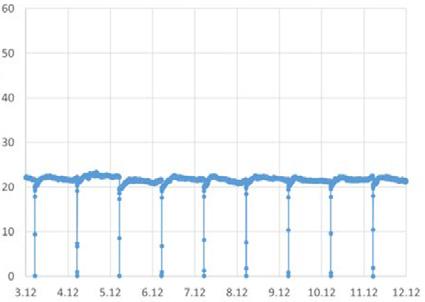Figure 3 shows 24-hour cycles without heavy pollution on December 10 and 11, 2021. On December 13, the flushing program started, but the pump did not immediately deliver the desired flow rate since dissolved pollution needed to be rinsed out. The pump will not give the expected flow rate until it has fully rinsed everything out.