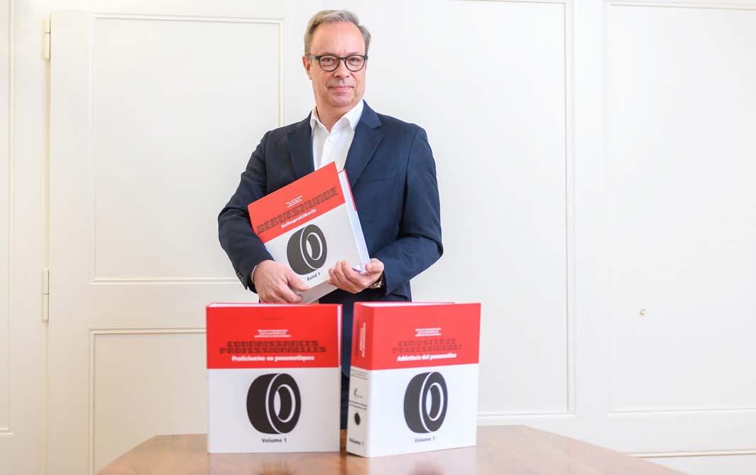 Sven Sievi zeigt stolz das für Reifenpraktiker entwickelte Lehrbuch. Dies in allen drei Landessprachen.