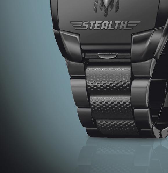 Questo esclusivo orologio da collezione si presenta con una solida cassa in metallo, ri nita con un’elegante placcatura ionica nera opaca. Tuttavia, la caratteristica innovativa di questo orologio da polso è il coperchio mimetico apribile, che protegge il quadrante con un design ispirato alla mira di precisione. Sul coperchio è inciso in rilievo un dinamico jet stealth, ri nito con una placcatura ionica in gunmetal. Il retro dell’orologio mostra la sagoma di un jet stealth, con sotto l’incisione del numero univoco della sua edizione personale – così, ogni orologio diventa un prezioso pezzo unico. Riceverà il suo orologio in un’elegante confezione di presentazione – ideale anche come regalo.
