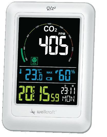 Avec cet appareil de mesure de CO₂ vous pourrez déterminer la quantité de dioxyde de carbone dans l’air. L’appareil vous indique visuellement avec des symboles sous forme de smiley quand la concentration de CO₂ est trop élevée et que vous devez aérer.