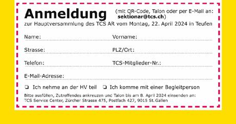 bis 1. Mai 2024 bei www.tcsar.ch oder beim TCS-Service-Center St. Gallen, Tel. 071 313 75 00