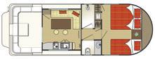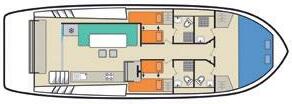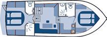 • Kabine vorne mit Doppelbett; Seitenkabine mit 2 Etagenbetten und 2 Kabinen hinten, eine mit Doppelbett, die andere mit 2 Einzelbetten, umwandelbar in ein Doppelbett.