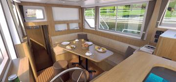 • Vorne, Esszimmer umwandelbar in ein Doppelbett oder 2 Einzelbetten und Kabine hinten mit Doppelbett.