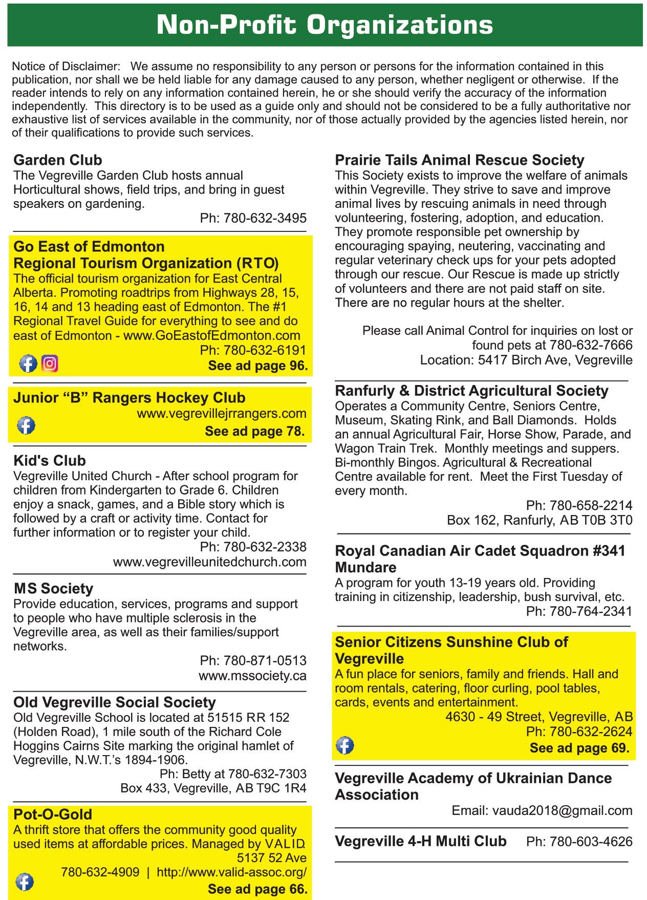 NoticeofDisclaimer: Weassumenoresponsibilitytoanypersonorpersonsfortheinformationcontainedinthispublication,norshallwebeheld liableforanydamagecausedtoanyperson,whethernegligentorotherwise. Ifthereaderintendstorelyonanyinformationcontainedherein,heor sheshouldverifytheaccuracyoftheinformationindependently Thisdirectoryistobeusedasaguideonlyandshouldnotbeconsideredtobea fullyauthoritativenorexhaustivelistofservicesavailableinthecommunity,norofthoseactuallyprovidedbytheagencieslistedherein,noroftheir qualificationstoprovidesuchservices.Thelistingofanagencydoesnotnecessarilyconstituteendorsementofitspurpose,method,orqualityof service by the Town of Vegreville or the County of Minburn. Any personal information printed in this Community Services Directory has been obtainedandusedwithwrittenpermissionfromthosepartieslisted,inaccordancewiththeFreedomofInformationandProtectionofPrivacyAct.