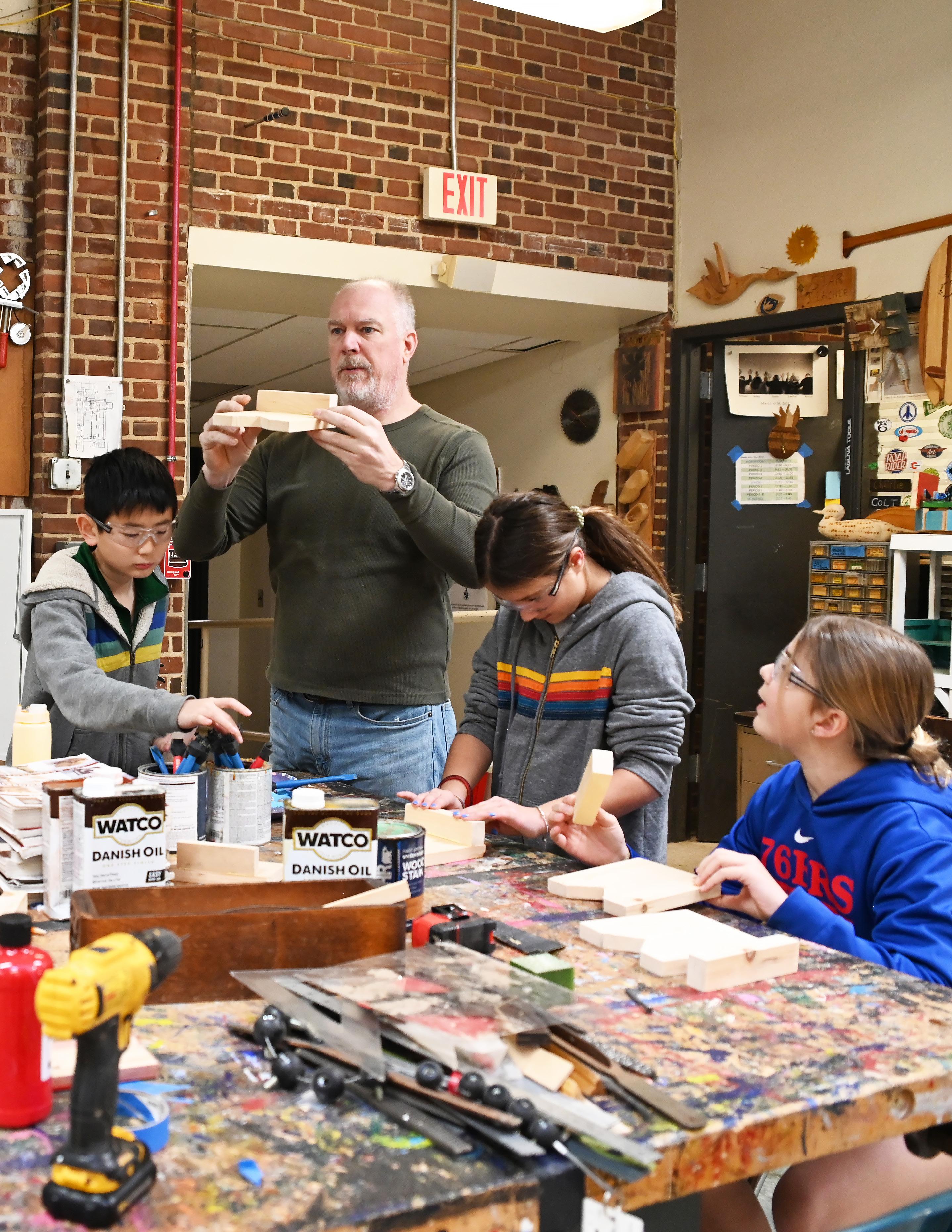 In fifth grade, students divide their year between one semester of art and one semester of woodshop. In art class, they practice creative techniques such as pastel gradation and hand-built ceramics, developing both technical ability and personal expression. In woodshop, they focus on craftsmanship and practical skills through the construction of the traditional Tower Hill School step stool, a signature project that has been part of the school’s program for generations.