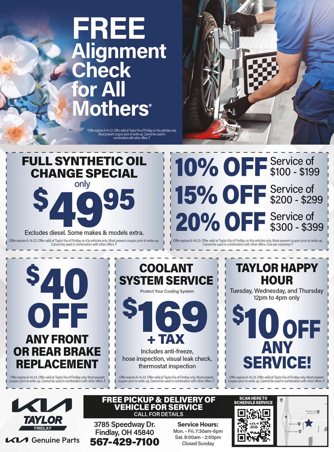 3701 Speedway Drive, Findlay Service: (833) 625-1868 Monday - Friday 8am - 6pm Saturday - 8am-12pm HOURS: CABIN AIR FILTER AIR FILTER SE T OF 2 WIPER BL ADES $59.99 INSTALLED* $34.99 INSTALLED* $49.99 INSTALLED* $15OFFANY OIL CHANGE* $10 OFF ANY OIL CHANGE* E VER Y WEDNESDAY E VER Y SAT URDAY SENIOR S GE T BUY A SE T OF 4 TIRES AND RECEIVE A FREE ALIGNMENT * BR AKE JOB Per axle $259* INCLUDES PADS & MACHINING ROTORS Shuttle Service O ered for All Ser vice Appointments *Applicable taxes extra. See dealer forcomplete details. TAYLOR HYUNDAI OF FINDLAY
