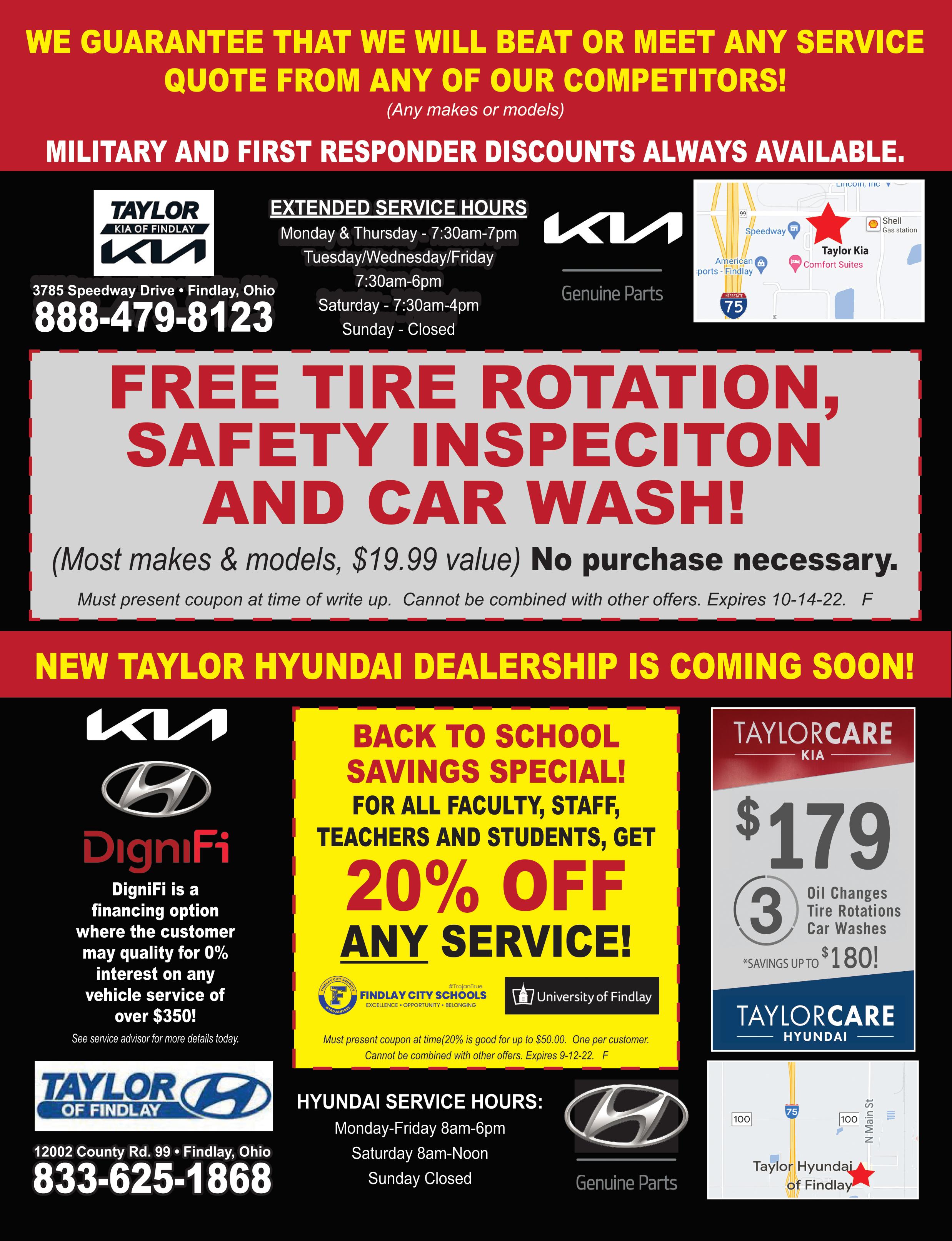 419-427-9999 Monday - closed Tuesday-Thursday - 11:30 to 8pm Friday - Saturday - 11:30 to 9pm Sunday - 11:30 to 8pm • Dine in • Carry out FRIDAY LUNCH BUFFET Buy One Buffet with beverage Get 2nd Buffet FREE 8 Tokens FREE with every kids buffet purchase Excludes birthday parties, special events, fund raisers. Expires 10/15/22 STUDENT & FACULTY SPECIAL Buffet with drink purchase with student or faculty ID CARRY OUT SPECIAL 1 large, 1 topping pizza $5.00 $5.29 Expires 10/15/22 Expires 10/15/22 Expires 10/15/22 7535 Patriot Drive, Findlay We accept most credit cards TIFFIN LOCATION FINDLAY LOCATION 110 Cr ystal Ave., Unit 8 2226 W. Market St. 419-455-0117 Tint Special 75$ 00 2 front windows + Tax MUST PRESENT COUPON TO RECEIVE DISCOUNT. EXPIRES 10/15/22 MUST PRESENT COUPON TO RECEIVE DISCOUNT. EXPIRES 10/15/22 off 10% Detail Special All detail ser vices, including Diamond Ceramic Coating Full windshield tint 140$ 00 + Tax