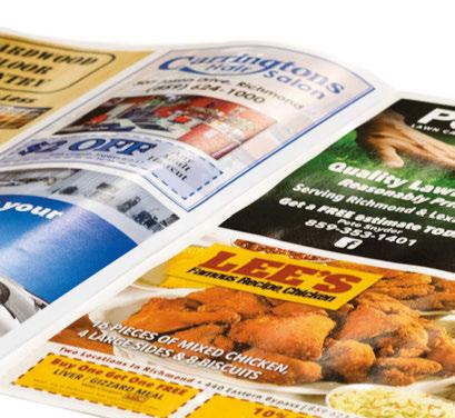 Local advertising made easy. Attract repeat customers. Grow your business. Contact Dianna Bess for more information. 419.680.6701 | diannabess@townmoneysaver.com EFFECTIVE | AFFORDABLE | CONVENIENT | TARGETED MAGAZINE ADS DIGITAL PACKAGE | FREE with every ad • Business profile and printable coupon listings on the TMS website • Listing on the TMS mobile app • Promotion on the local TMS Facebook page PREMIUM PRODUCTS • Individual Inserts • Stand-Alone Postcards • Menus, Door Hangers & More