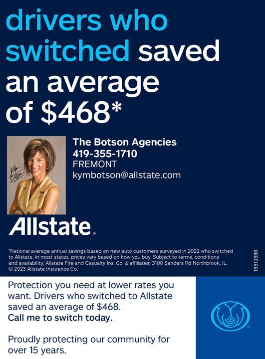 BUCKEYE AUTO SALVAGE BUYING UNWANTED JUNK & REPAIRABLE VEHICLES. Paying up to $2,500! 938 St. Rte. 18 • Bellevue 419-483-8101 We now sell auto parts & tires! • Water Softeners • Drinking Water Systems • Chlorination Systems • Filtration Systems • Iron/Sulfur Removal Don’t miss our SALT SALE the 2nd Saturday of every month! CALL 419-332-7329 and say “Hey, Culligan Man!” FREE Water Softener Check-up (any make or model) Must present this coupon at time of signing. Expires 06-15-23. Must present coupon. Expires 06-15-23. Culligan of Fremont 507 Tiffin Street • Fremont, Ohio FREE In-House Water Test