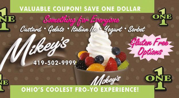 ® PERKINS AVE RT 2 RT 250 C O L U M B U S A V E C A M P B E L L S T RT101 RT 4 HAYES AVE KROGER MIKEY’S NEW: Made-to-Order Cannolis! Cannolis! 419-502-9999 www.mikeysfroyo.com • 419-502-9999 414 W. Perkins Ave • Sandusky, Ohio Connect With Us to Receive Special Offers and Updates. HOURS: WED & THU 3-9pm FRI & SAT 3-10pm SUNDAY 1-9pm Like Us on Facebook mikeysfroyo Follow Us on Twitter @mikeysfroyo ® Call us about Fundraising opportunities! Vegan Friendly & Non-Dairy Options Order yours today! Coconut Milk • Custard • Gelato • Yogurt • Sorbets • Italian Ice Something for Everyone OUR FRUIT IS ALWAYS FRESH! Valid on purchase of $5.00 or more. Cannot be combined with other offers. No cash value.