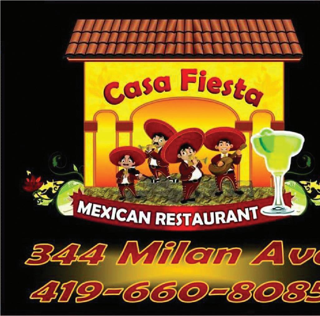 HOURS: Mon-Thurs 11am-10pm Fri-Sat 11am-11pm Sun 11:30am-9pm MONDAY NIGHT FOOTBALL SPECIALS: Wings 5 for $4.99, 8 for $7.99, and 12 for $11.99 12 oz. Drafts $1.99 for domestics, $2.50 for imports 2 or 3-item combos $2.00 OFF TACO TUESDAY NIGHT: Beef or Chicken Hard shell $1.99 Soft shell $2.25 FREE Buy one combo at regular price, receive one KID’S MEAL Casa Fiesta • Norwalk • 419-660-8085 Casa Bravo • Norwalk • 567-743-9123 Cannot be used with any other offers. With coupon. 1 coupon per table. Monday -Thursday only. Expires 09-29-22. 1/2 OFF Buy 1 lunch at regular price, get 2nd Casa Fiesta • Norwalk • 419-660-8085 Casa Bravo • Norwalk • 567-743-9123 Cannot be used with any other offers. With coupon. 1 coupon per table. Monday -Thursday only. Expires 09-29-22. LUNCH Casa Fiesta • Norwalk • 419-660-8085 Casa Bravo • Norwalk • 567-743-9123 Cannot be used with any other offers. With coupon. 1 coupon per table. Monday -Thursday only. Expires 09-29-22. Buy two combos at regular price, get FREE DESSERT Casa Fiesta • Norwalk • 419-660-8085 Casa Bravo • Norwalk • 567-743-9123 Cannot be used with any other offers. With coupon. 1 coupon per table. Expires 09-29-22. $3 OFF SPEND $50, GET WE CAN CATER YOUR EVENTS! CALL US FOR DETAILS! Come in and try our NEW MARGARITA TIPSY TOWER! Come check out our large variety of margaritas! THURSDAY NIGHT IS LADIES’ NIGHT! We have a DJ from 6-9pm, and drink specials, including 12 oz. lime margaritas $3.25, strawberry margaritas $3.99. GUYS! $1.99 for domestic draft beers! Watch your favorite teams! ATTENTION, BUFFET LOVERS: IT’S BACK! Available 11-2 Sunday through Thursday