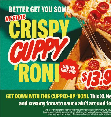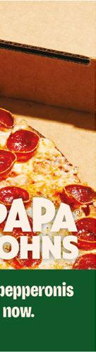 Sandusky 710 W. Perkins Ave. 419 609-9444 — Locally Owned & Operated — PAPAJOHNS.COM Now Hiring. Drivers! Pizza-Makers! All shifts! Call or stop in, and ask for a manager. Start Today! FREE Delivery! FREE! Let us do the driving! Spend $40 or more, and delivery is Not valid with other offers. Good at participating restaurants. Limited delivery area; charges may apply. Customer responsible for all applicable taxes. Expires 05-15-24. Become a Papa John’s Rewards member, and earn Sign up today at papajohns.com Medium Pizza Deal $7 99 2 Medium 2-Topping Pizzas for EACH Order Online at papajohns.com With coupon. Good at participating restaurants. Limited delivery area. Expires 05-15-24. 2 Large Pizzas Choose your favorite TWO toppings on TWO of our large crust pizzas for just 2 x Large x 2 $1249 Not valid with other offers. Good at participating restaurants. Limited delivery area; charges may apply. Customer responsible for all applicable taxes. Expires 05-15-24. EACH FREE FOOD! Original or Thin Crust