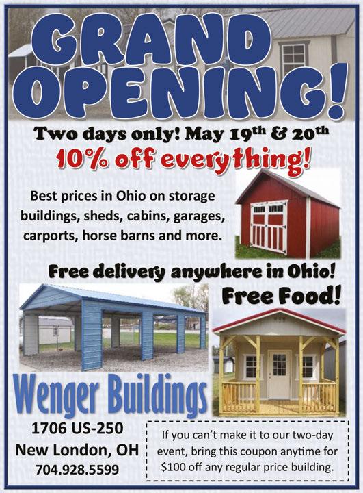 Huron Outdoor Shop Sawmill Mini Storage and Tool Rental We’ll take your trade-in! 1803 Sawmill Parkway Huron, Ohio 44839 419-433-6979 huronoutdoorshop.com • Ask about car & boat storage • Used equipment available • Used walk behind mowers starting at $75 • Chainsaws • Tillers • Generators • Mowers • Motorcycles • ATVs • Trimmers • Firearms WE BUY / SELL TRADE / TRANSFER FIREARMS! One coupon per customer. With coupon. Not valid with any other offer. Expires 06-13-23. 1/2 OFF PICK-UP or DELIVERY $79.99 (+ parts if needed) LAWN MOWER SERVICE SPECIAL WE SELL FIREWOOD! WE HAVE HONDA LAWN MOWERS IN STOCK! MG Carpet Cleaning Locally Owned & Operated 567.228.7533 • Boat and car upholstery cle nd cleaning • We clean fabrics others can’t! • Product safe and non-toxic • No sticky, oily residue to cause rapid resoiling • Non-flammable, biodegradable • Carpet dry in approx. 1 hour • Carpet left soft and clean FACT BETTER, : The owner of our company will come to your house and clean your carpets. Carpets are clean and dry in 15-60 minutes. No overwetting, which can foster microbial growth and attract new dirt instantly. FREE CARPET DEODORIZER With any spring carpet cleaning special. Stairs are not considered a room. Coupon required. Expires 06-15-23. Areas over 250 sq. ft. are considered separate areas. Stairs are not considered a room. Coupon required. Expires 06-15-23. FREE Kitchen Vinyl Floor Cleaning SPRING SPECIAL Any 3 Rooms Any 4 Rooms SERVING HURON, OTTAWA, ERIE, & SANDUSKY COUNTIES WE DO COMPLETE CAR DETAILING! RESIDENTIAL & COMMERCIAL CLEANING! S S $99 $109