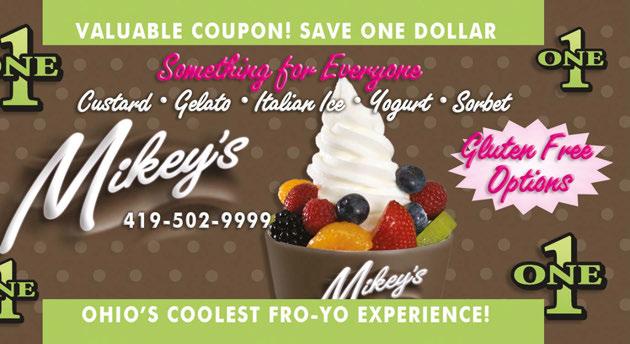 ® PERKINS AVE RT 2 RT 250 C O L U M B U S A V E C A M P B E L L S T RT101 RT 4 HAYES AVE KROGER MIKEY’S 419-502-9999 www.mikeysfroyo.com • 419-502-9999 414 W. Perkins Ave • Sandusky, Ohio Connect With Us to Receive Special Offers and Updates. HOURS: WED & THU 3-9pm FRI & SAT 3-10pm SUNDAY 1-9pm Like Us on Facebook mikeysfroyo Follow Us on Twitter @mikeysfroyo ® Vegan Friendly & Non-Dairy Options Coconut Milk • Custard • Gelato • Yogurt • Sorbets • Italian Ice Something for Everyone OUR FRUIT IS ALWAYS FRESH! Valid on purchase of $5.00 or more. Cannot be combined with other offers. No cash value. NEW: Made-to-Order Cannolis! Order yours today! Mother’s Day is May 14th! KIDS ONLY: Buy one for yourself, and Mom gets one FREE! FREE item of equal or lesser value. Offer valid 05-14-23 only.