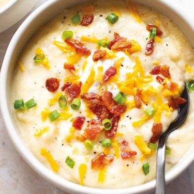 3. If you’d like to use cheeses and bacon as a garnish, reserve 1/4 cup of t each. Stir in the remaining cheeses, remaining bacon, and the sour cream. Remove the pot from the heat. Scoop potato chunks into the pan, leaving them chunky, depending on your preference. Serve hot, topped with your favorite garnishes, like cheese, bacon and chives.
