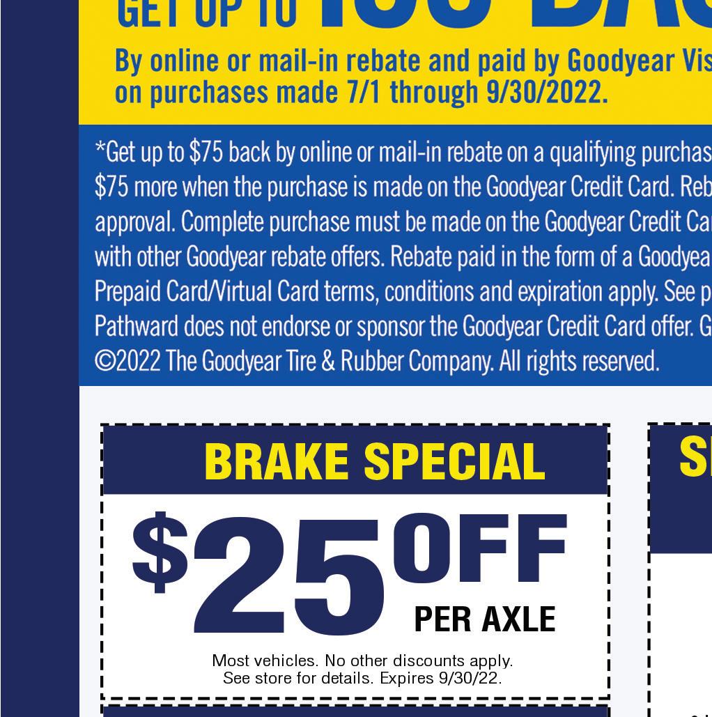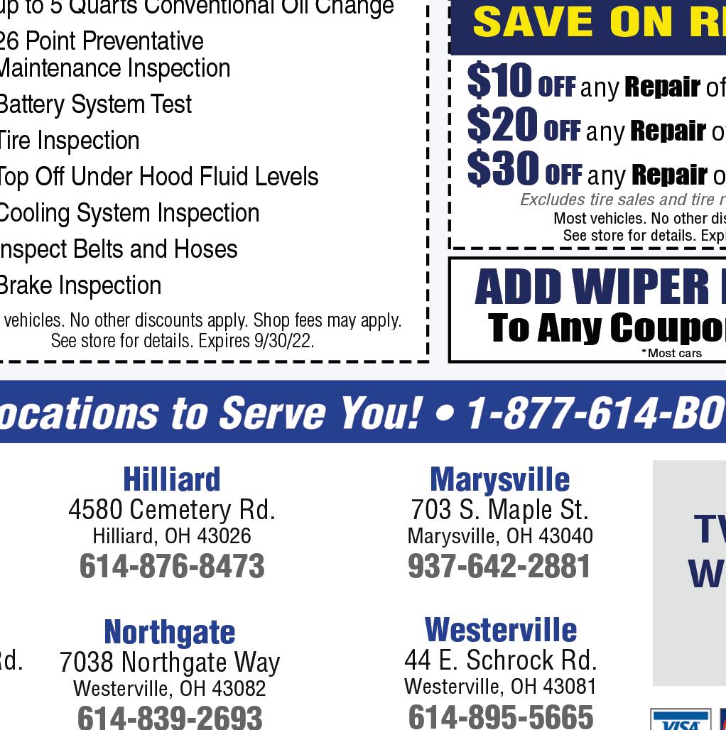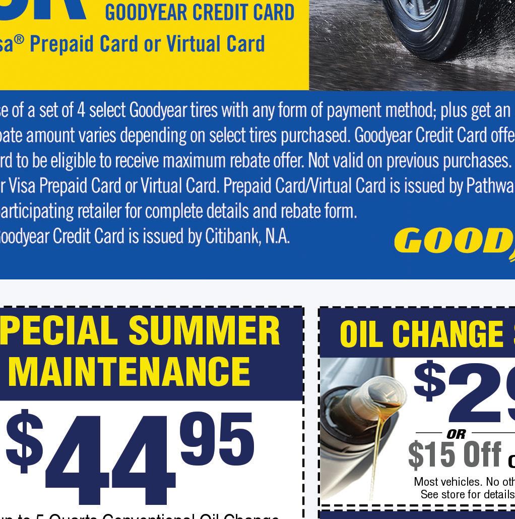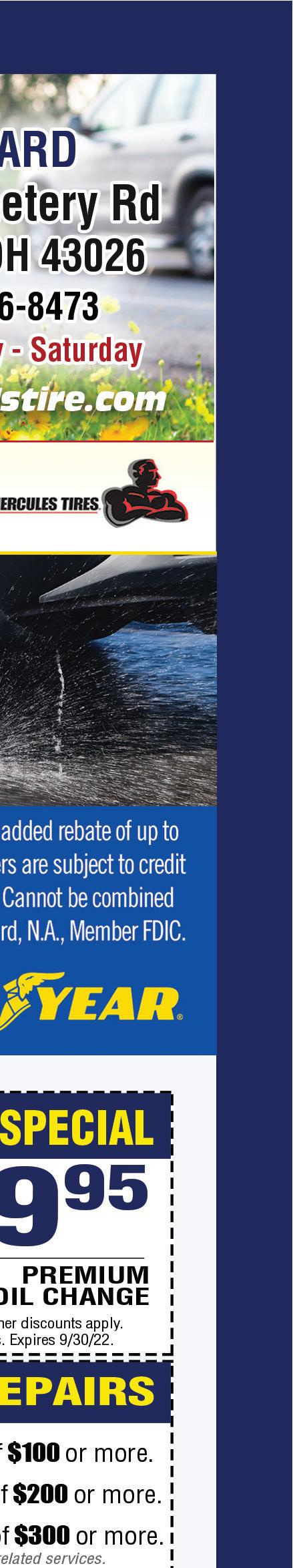 NOW OFFERING Contactless Service & Repairs HOURS: MONFRI 7:30AM 7PM•SAT 8AM 4PM•SUNDAY CLOSED Family Owned and Operated! 4983 Roberts Road • Hilliard, OH 4983 Roberts Road • Hilliard, Ohio | 614-777-1110 Not valid with any other offers or discounts. richeygoodyear.com Expires 9/30/22. H FREE BRAKE INSPECTION 4983 Roberts Road • Hilliard, Ohio | 614-777-1110 Not valid with any other offers or discounts. richeygoodyear.com Expires 9/30/22. H 4983 Roberts Road • Hilliard, Ohio | 614-777-1110 Not valid with any other offers or discounts. richeygoodyear.com Expires 9/30/22. H $10 OFF SYNTHETIC BLEND OR FULL SYNTHETIC OIL Includes: • Lube, where applicable • New oil filter installed • Up to 5 qts. Major oil brand (brands vary) 4983 Roberts Road • Hilliard, Ohio | 614-777-1110 Not valid with any other offers or discounts. richeygoodyear.com Expires 9/30/22. H $100 - $199.99 – Get $10 Off $ 300 or More – Get $ 30 Off $200 - $299.99 – Get $20 Off SLIDING SCALE COUPON Does not apply to tire purchases 4983 Roberts Road • Hilliard, Ohio | 614-777-1110 Not valid with any other offers or discounts. richeygoodyear.com Expires 9/30/22. H $50 OFF 4 TIRES WITH WHEEL ALIGNMENT 4983 Roberts Road • Hilliard, Ohio | 614-777-1110 Not valid with any other offers or discounts. richeygoodyear.com Expires 9/30/22. H $5499 THIS SERVICE INCLUDES: • Lube, new ffilter & up to 5 quarts of synthetic blend oil (full synthetic $25 extra) • Complete tire rotation • Check tread depth on all 4 tires • Adjust air pressure to manufacturer’s speciffications • Inspect and clean battery terminals and connections • Top o all ₍uids under the hood • Examine all belts and hoses for cracks and proper tension • Brake inspection SUMMER CAR CARE PACKAGE Call us today for appointments or schedule it online at our website! www.richeytire.com • www.richeygoodyear.com • 614-777-1110 @RicheyTire Follow us on Facebook, Twitter & Instagram! (if brake work is performed, $29.99 value.) FREE A/C PERFORMANCE TEST (if A/C work is performed, $29.99 value.)