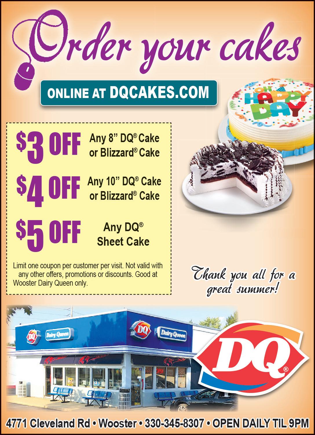 CLOSING OCT. 30TH FOR THE SEASON. CLOSING OCT. 30TH FOR THE SEASON. Expires 10-30-22 WTMS ® Sheet Cake ® Cake or Blizzard® ® Cake or Blizzard® Cake Limit one coupon per customer per visit. Not valid with any other offers, promotions or discounts. Good at Wooster Dairy Queen only. Expires: 10-25-22 WTMS $3 OFF $4 OFF $5 OFF
