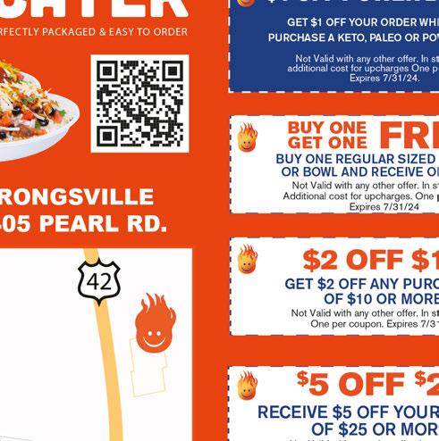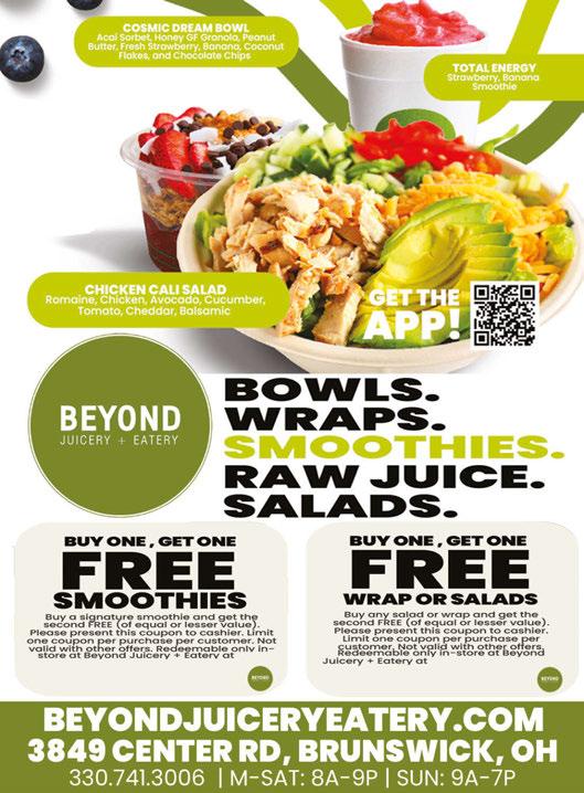BRUNSWICK June 2024 Shop locally. Save locally. Scan our QR code to fi nd your perfect invitation! Excludes Oakley. Valid with coupon. Cannot be combined with insurance. Expires 7/11/24 $10 OFF ANY PURCHASE Valid with coupon. Not valid with any other offer. Expires 7/11/24. TMS10off DIAMOND PASS FREE SUNBED OR SPRAY TAN NEW CUSTOMERS ONLY Restrictions may apply. See Store for Details.Valid with coupon. Not valid with any other offer. Expires 7/11/24. TMSDP NEW RED LIGHT THERAPY AND MASSAGE CHAIRS Valid at Brunswick location only. One coupon per customer per visit.Offers cannot be combined. Must present coupon at time of purchase. Expires 7/15/24 PULPJUICEANDSMOOTHIE.COM Valid at Brunswick location only. One coupon per customer per visit.Offers cannot be combined. Must present coupon at time of purchase. Expires 7/15/24 Valid at Brunswick location only. One coupon per customer per visit.Offers cannot be combined. Must present coupon at time of purchase. Expires 7/15/24 Valid at Brunswick location only. One coupon per customer per visit.Offers cannot be combined. Must present coupon at time of purchase. Expires 7/15/24 NEW HEALTHY SMOOTHIES, WRAPS, SALADS, FRESH JUICES AND IMMUNE BOOSTING WHEATGRASS AND GINGER SHOTS! LET US CATER YOUR PARTY! BRUNSWICK 3840 Center Rd. (LOCATED BEHIND DOLLAR GENERAL) 330.410.7170 FAMILY FEAST SPECIAL 4 Large Cheesesteaks or Hoagies 4 Small Fresh Cut Fries, 4 Fountain Drinks $ 40 ANYTIME SPECIAL $ 11 1 Large Sandwich, 1 Small Fry or Tot, 1 Fountain Drink Valid only with coupon. Not valid with any other offers, coupons or promotions. Valid at any location. Expires 7/15/24 BOGO Any Sandwich 50% OFF Equal or Lesser Value 10% OFF Catering Valid only with coupon. Not valid with any other offers, coupons or promotions. Valid at any location. Expires 7/15/24 Valid only with coupon. Not valid with any other offers, coupons or promotions. Valid at any location. Expires 7/15/24 Valid only with coupon. Not valid with any other offers, coupons or promotions. Valid at any location. Expires 7/15/24 COMING SOON