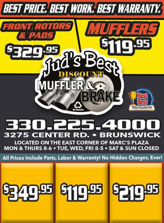 INSTALLED! MOST CARS INSTALLED! MOST CARS STARTING AT One Year Warranty Lifetime Warranty 5 Year Warranty INSTALLED! MOST CARS 1 Year Warranty INSTALLED! MOST CARS 2 Year Warranty UNIVERSAL CATALYTIC CONVERTERS FLEX PIPES STARTING AT HUB BEARINGS STARTING AT 3849 Center Rd • Brunswick, OH Only. Expires 7/11/24 3849 Center Rd • Brunswick, OH Only. Expires 7/11/24 $5 OFF Any Purchase $20 or More Any Purchase $30 or More Not valid with any other offer. Valid with TMS coupon only. Expires 7/11/24 Coupons Valid Sunday Through Thursday Only. Not Valid on Friday or Saturday Not valid with any other offer. Valid with TMS coupon only. Expires 7/11/24 Coupons Valid Sunday Through Thursday Only. Not Valid on Friday or Saturday Not valid with any other offer. Valid with TMS coupon only. Expires 7/11/24 Coupons Valid Sunday Through Thursday Only. Not Valid on Friday or Saturday Carry-Out Menu • Full Liquor Service • Children’s Menu • Complimentary Chips & Salsa Monday - Thursday 11am-10pm • Friday 11am-10:30pm Saturday 12pm-10:30pm • Sunday 12pm-9:30pm Entire Menu Available Online for Carryout and Delivery thru www.Cozumel.us JUMBO MARGARITAS $7.95 PITCHERS $19.95 LIME ONLY MARGARITA SPECIAL AVAILABLE EVERY TUESDAY & SATURDAY Any Purchase $10 or More JOIN US ON THE DECK! 625 Pearl Road • Brunswick 330-220-3335 Mexican Restaurant B B B