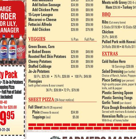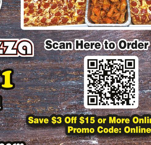 #604 #605 #606 Must mention coupon when ordering & present upon payment. Not valid with other offers or specials. Expires 7/15/24 Must mention coupon when ordering & present upon payment. Not valid with other offers or specials. Expires 7/15/24 Must mention coupon when ordering & present upon payment. Not valid with other offers or specials. Expires 7/15/24 Must mention coupon when ordering & present upon payment. Not valid with other offers or specials. Expires 7/15/24 Must mention coupon when ordering & present upon payment. Not valid with other offers or specials. Expires 7/15/24 Must mention coupon when ordering & present upon payment. Not valid with other offers or specials. Expires 7/15/24 #601 #602 #603 PIZZA OF THE MONTH Try Our CHARLESTON Your Choice of BBQ Base, (Regular, Sweet or Spicy), Mozzarella, Pulled Pork, Bacon & Cheddar 9” SMALL $15 12” MEDIUM $22 16” XLARGE $28 LET’S PARTY! FULL SHEET PIZZA 40 Slice Cheese only $26 (Additional Toppings $6 reg / $9 prem)