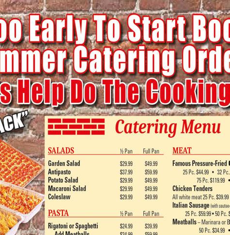 (48 hr. Notice) Not valid with other offers. With coupon. Expires 7/11/24. ATTILIO’S 330-225-2828 Additional charge for Bone-In Wings. Not valid with other offers. With coupon. Expires 7/11/24. ATTILIO’S 330-225-2828 Additional charge for Bone-In Wings. Not valid with other offers. With coupon. Expires 7/11/24. ATTILIO’S 330-225-2828 Not valid with other offers. With coupon. Expires 7/11/24. ATTILIO’S 330-225-2828 Not valid with other offers. With coupon. Expires 7/11/24. ATTILIO’S 330-225-2828 Not valid with other offers. With coupon. Expires 7/11/24. ATTILIO’S 330-225-2828 Additional charge for Bone-In Wings. Not valid with other offers. With coupon. Expires 7/11/24. ATTILIO’S 330-225-2828 (24 hr. Notice) Not valid with other offers. With coupon. Expires 7/11/24. ATTILIO’S 330-225-2828 Additional charge for Bone-In Wings. Not valid with other offers. With coupon. Expires 7/11/24. ATTILIO’S 330-225-2828 (48 hr. Notice) Not valid with other offers. With coupon. Expires 7/11/24. ATTILIO’S 330-225-2828 *Extra Cheese, Bacon, or Chicken are Considered 2 Items 1733 Pearl Road Brunswick (Located in Laurel Square Shopping Center) Pick-Up, Delivery or Dine In 330-225-2828 Since 1955 Family Special LARGE 2 Item Pizza, Dozen Wings, Garlic Bread w/Cheese $2799 SHEET 1 ITEM PIZZA $2495 No limit MEDIUM 2 ITEM PIZZA & 1 Dozen Wings $20 No limit SPRING SPECIAL 1 Item Sheet Pizza (32 pieces) & 50 Wings (1 1/2 hr notice) $60 LARGE PIZZA 16” - 12 Cuts with 2 items $1449 No limit 2 LARGE PIZZA 16” with 1 items $27 No limit MEDIUM 2 ITEM PIZZA $10 No limit 2 MEDIUM 1 ITEM PIZZA (12”, 8 cut) 2 Doz Wings $3899 5 lbs. Steak Fajitas 5 lbs. Chicken Fajitas 5 lbs. Pork Fajitas 3 lbs. Cheese, Rice, Refried Beans, Peppers & Onions, Soft Tacos, Burritos, Tortilla Chips, Salsa TACO BAR $33999 (Serves 30) Full Tray of Sausage & Peppers Full Tray of Meatballs 80 Tenders Full Tray of Cheese Potatoes Full Tray of Rigatoni 2 Sheet Pizzas 1 Item $37999 (Serves 50) -or$19999 (Serves 25) PARTY PACK #2 Full Tray of Rigatoni 2 Sheet Pizzas 1 Item 100 Wings $14999 (Serves 30) PARTY PACK #3 (48 hr. Notice) Additional charge for Bone-In Wings. Not valid with other offers. With coupon. Expires 7/11/24. ATTILIO’S 330-225-2828 2 Sheet Pizzas 1 Item 50 Wings 40 Tenders 1/2 Tray of JoJo’s $15999 (Serves 25) PARTY PACK #4 (48 hr. Notice) Additional charge for Bone-In Wings. Not valid with other offers. With coupon. Expires 7/11/24. ATTILIO’S 330-225-2828 $22000 (Serves 15-20) BACKYARD BBQ (48 hr. Notice) Not valid with other offers. With coupon. Expires 7/11/24. ATTILIO’S 330-225-2828 3 Slabs of Ribs 20 pc Roasted/BBQ Chicken 3 lbs Pulled Pork Bake Beans • Mac & Cheese Corn Bread $21999 (Serves 30-35) PARTY PACK #5 (48 hr. Notice) Not valid with other offers. With coupon. Expires 7/11/24. ATTILIO’S 330-225-2828 80 Tenders Full Tray of Rigatoni Full Tray of JoJo Potatoes Full Tray of Salad 1-1 Item Sheet Pizza MON & TUES MANIA 2 Medium 1 Item Pizzas $1399 NEW PIZZA Big New Yorker 18" 1 Item Pizza $1499 No coupon needed For a Full Catering Menu go to www.attiliospizzeria.com Congratulations