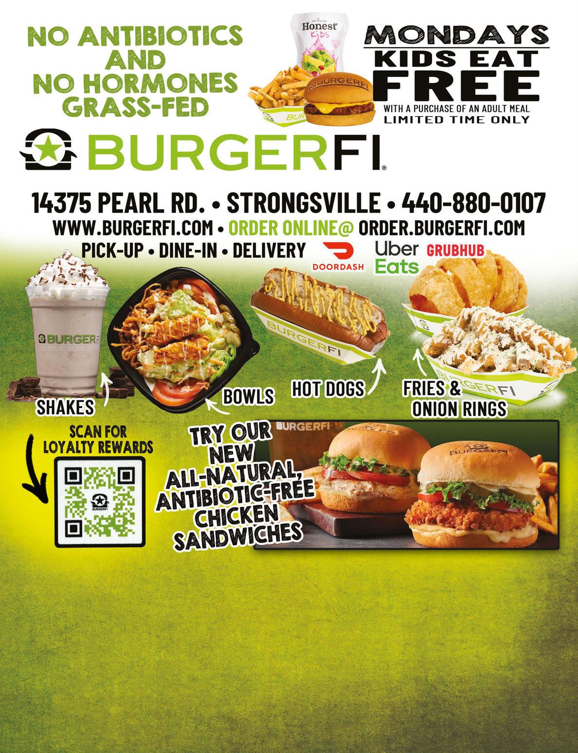 FREE KIDS MEAL WITH PURCHASE OF A REGULAR MEAL Offer valid only at BurgerFi Strongsville. Expires on 7/11/2024. Cannot be combined with any other offer or BurgerFi Reward. No Substitutions. In-restaurant orders only; offer not valid for online, phone, or delivery orders. © 2024 BURGERFI International, Inc. FREE FRIES WITH PURCHASE OF A BURGER & DRINK Offer valid only at BurgerFi Strongsville. Expires on 7/11/2024. Cannot be combined with any other offer or BurgerFi Reward. No Substitutions. In-restaurant orders only; offer not valid for online, phone, or delivery orders. © 2024 BURGERFI International, Inc. $7 OFF PURCHASE OF $30 OR MORE Offer valid only at BurgerFi Strongsville. Expires on 7/11/2024. Cannot be combined with any other offer or BurgerFi Reward. No Substitutions. In-restaurant orders only; offer not valid for online, phone, or delivery orders. © 2024 BURGERFI International, Inc. BUY ONE SHAKE GET 2ND SHAKE FREE Offer valid only at BurgerFi Strongsville. Expires on 7/11/2024. Cannot be combined with any other offer or BurgerFi Reward. No Substitutions. In-restaurant orders only; offer not valid for online, phone, or delivery orders. © 2024 BURGERFI International, Inc. OUTSIDE SEATING AVAILABLE