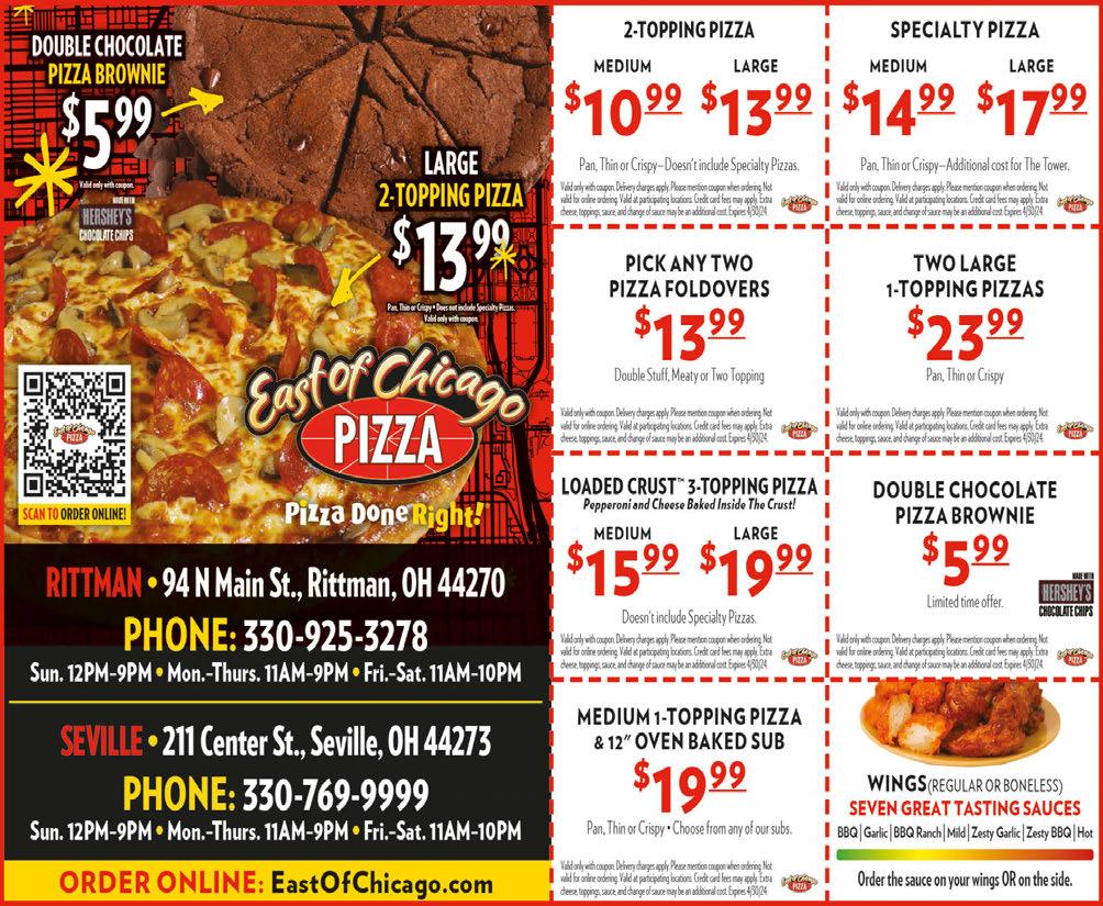 ORDER ONLINE: EastOfChicago.com MONDAY MADNESS 1-Topping Half Sheet Pizza $14.99 Cannot be combined with any other offer. TWO TIMES TUESDAY Two 12 Inch Subs or Two 1-Topping Medium Pizzas $16.99 Cannot be combined with any other offer.