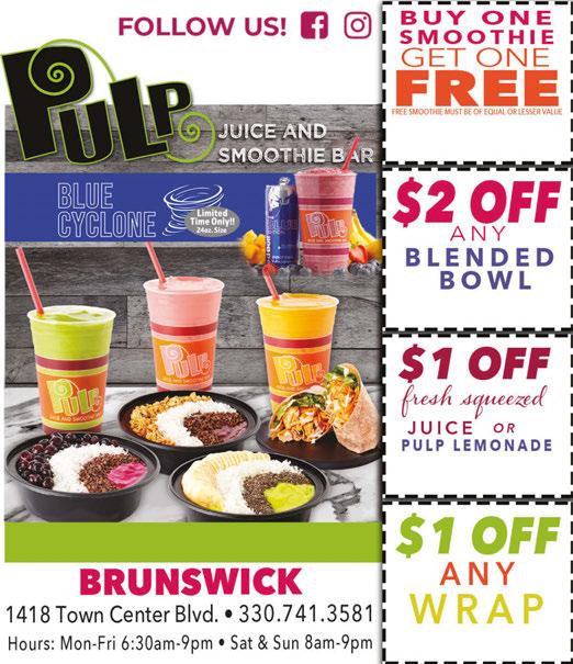 BRUNSWICK March 2024 Shop locally. Save locally. Scan our QR code to fi nd your perfect invitation! Valid at Brunswick location only. One coupon per customer per visit.Offers cannot be combined. Must present coupon at time of purchase. Expires 4/12/24 PULPJUICEANDSMOOTHIE.COM Valid at Brunswick location only. One coupon per customer per visit.Offers cannot be combined. Must present coupon at time of purchase. Expires 4/12/24 Valid at Brunswick location only. One coupon per customer per visit.Offers cannot be combined. Must present coupon at time of purchase. Expires 4/12/24 Valid at Brunswick location only. One coupon per customer per visit.Offers cannot be combined. Must present coupon at time of purchase. Expires 4/12/24 NEW HEALTHY SMOOTHIES, WRAPS, SALADS, FRESH JUICES AND IMMUNE BOOSTING WHEATGRASS AND GINGER SHOTS! $10 OFF ANY PURCHASE Valid with coupon. Not valid with any other offer. Expires 4/11/24. DIAMOND PASS FREE SUNBED OR SPRAY TAN NEW CUSTOMERS ONLY Restrictions may apply. See Store for Details.Valid with coupon. Not valid with any other offer. Expires 4/11/24. NEW RED LIGHT THERAPY AND MASSAGE CHAIRS Excludes Oakley. Valid with coupon. Cannot be combined with insurance. Expires 4/11/24