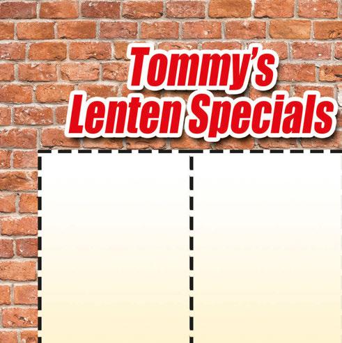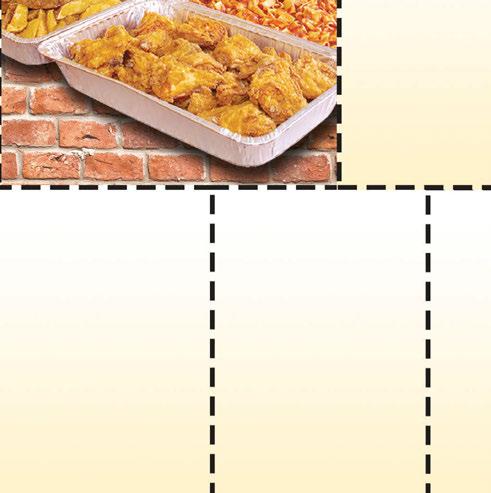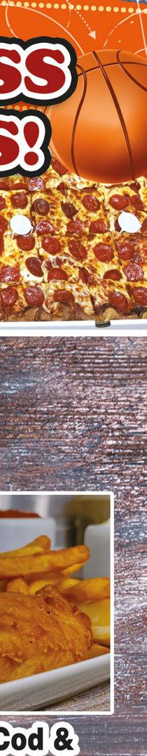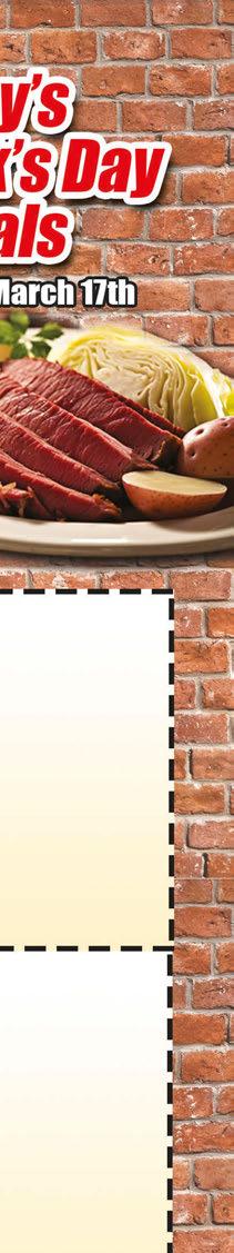 Fish-N-Chips • 3 pc. Fish • 4 Hush Puppies • Waffle Fries • Coleslaw $1499 Expires 4/30/24 Shrimp-N-Chips • 10 Breaded Shrimp • 4 Hush Puppies • Waffle Fries • Coleslaw $1799 Expires 4/30/24 Fish & Piergoies • 3 pc. Fish • 3 Pierogies • 4 Hush Puppies • Waffle Fries • Coleslaw $1799 Expires 4/30/24 Bowl of Clam Chowder $5 Expires 4/30/24 $300 OFF Any Size Cheese Pizza Expires 4/30/24 Crazy 8 • 8 pc. Chicken • 8 Jo-Jo Potatoes • 8 oz. Coleslaw • 4 Rolls & Honey Butter $2299 Expires 4/30/24 Pizza & Chicken Combo • 12” Medium 8 Slice 2-Topping Pizza • 8 pc. Chicken • 15 Jo-Jo Potatoes w/Ranch • 12 oz. Coleslaw • Rolls & Honey Butter $2999 Expires 4/30/24 Full Sheet Pizza PLUS 25 pc. Chicken $6995 Expires 4/30/24 The Party Pack • 50 Pieces of Chicken • 75 Jo-Jo Potatoes • Full Sheet 1-Topping Pizza • Full Pan of Rigatoni • Full Pan of Salad (Dressing not included) Serves 30-40 Add 40 Meatballs for $20 $23995 Expires 4/30/24 Small Party Pack • 25 Pieces of Chicken • 50 Jo-Jo Potatoes • 1/2 Pan Salad (Dressing not included) • 1/2 Pan Rigatoni • Full Sheet 1-Topping Pizza Add 20 Meatballs for $10 $16995 Expires 4/30/24 Mini Party Pack • 16 Pieces of Chicken • 30 Bone-in Wings OR 50 Boneless Wings • Full Sheet 1-Topping Pizza $9995 Expires 4/30/24 1/2 Pan of Corned Beef with Cabbage, Red Potatoes, Carrots, Rye Bread and Horseradish Sauce Serves 2-3 $2999 MARCH 17TH ONLY Hot Corned Beef By the Pound Served with Rye Bread and Horseradish Sauce $1999 MARCH 17TH ONLY