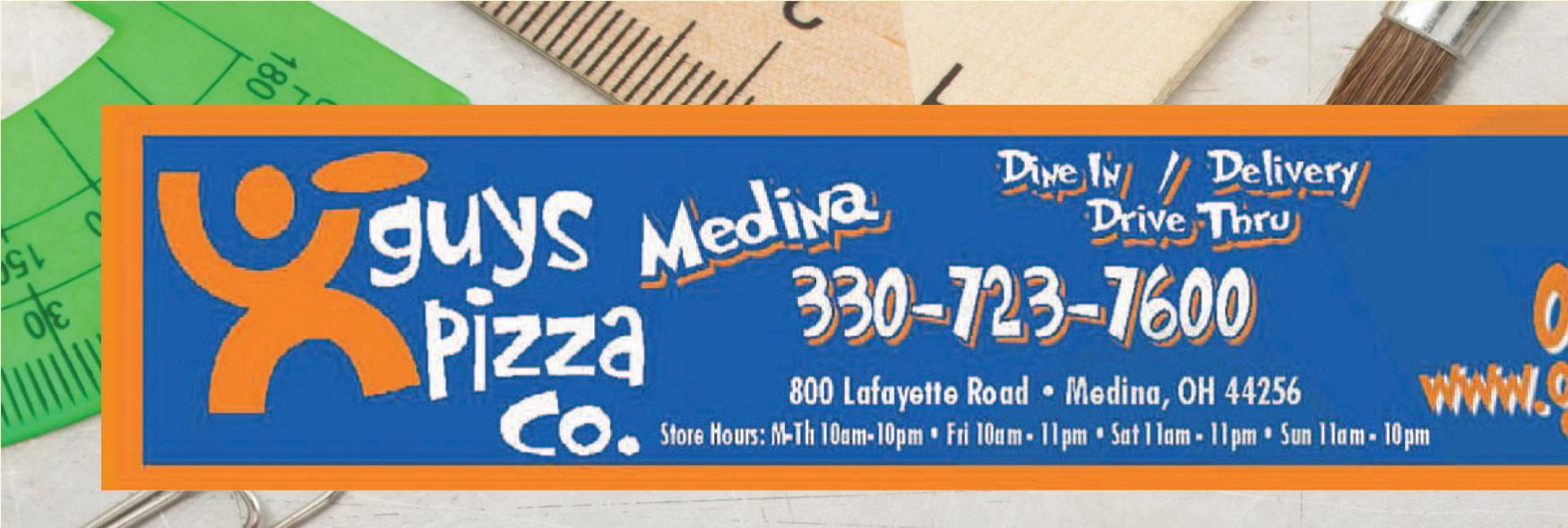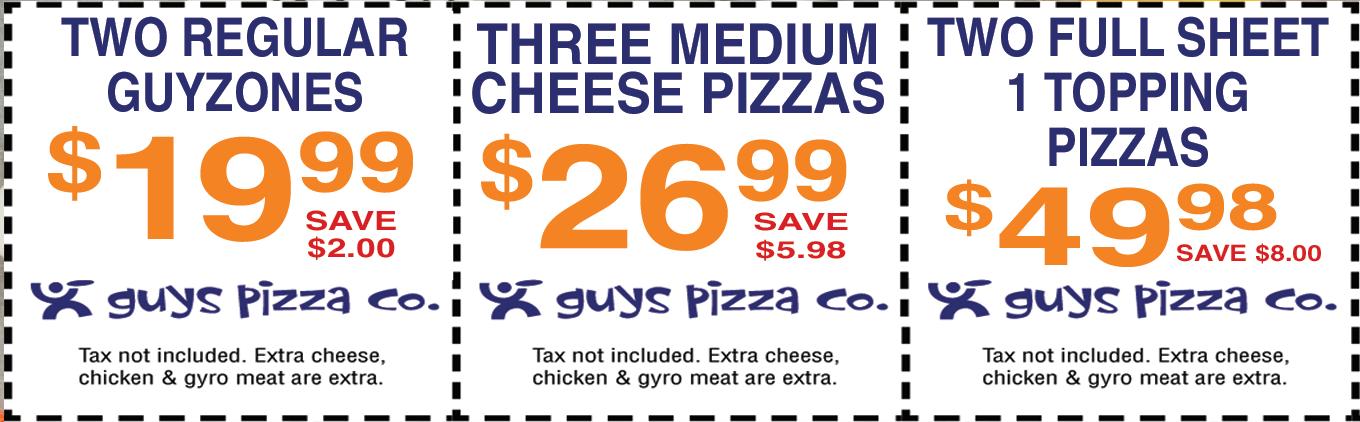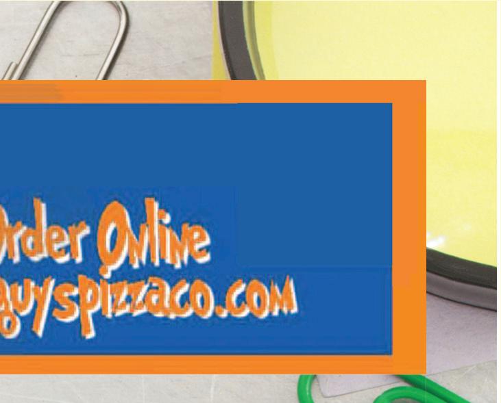 available in 12” only. Add $3.50 Note: Gluten Free Crust is prepared in a common kitchen with the risk of gluten exposure. Therefore, Guys Pizza Co. DOES for customers with Celiac disease. Customers with gluten sensitivities should exercise judgment in consuming this pizza. Small Medium Large Big Guy 1/2 Sheet Full Sheet 12.99 17.99 19.99 27.99 25.99 37.99 7.99 10.99 15.99 28.99 50¢ - 1.00 each