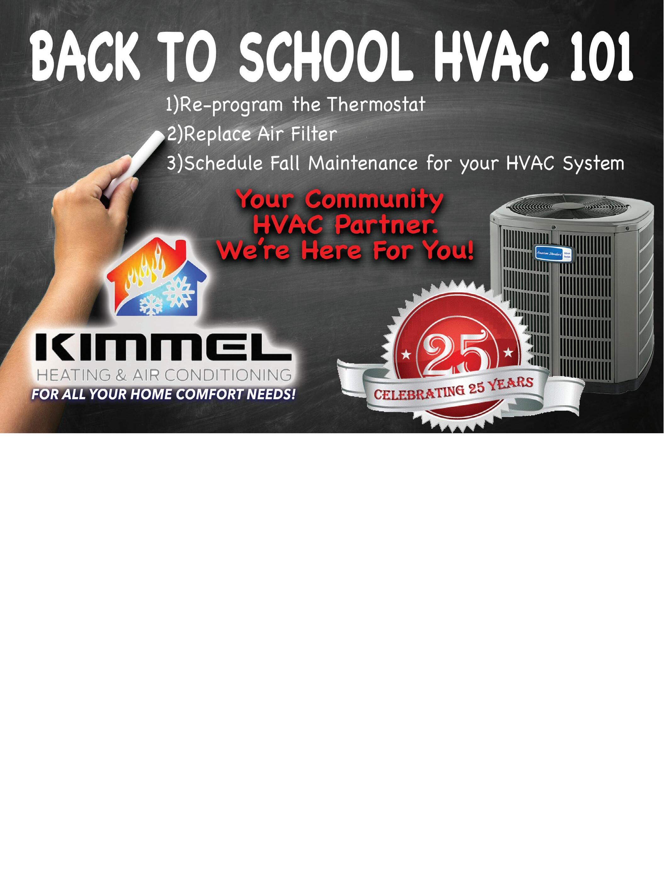 330-269-5671 License #15945 24 HOUR EMERGENCY SERVICE We Service All Makes & Models FURNACES – AIR CONDITIONERS – HUMIDIFIERS – HOT WATER TANKS – TANKLESS WATER HEATERS – HEAT PUMPS –AIR HANDLERS –BOILERS –TANKLESS BOILERS –THERMOSTATS –FILTERS –DIAGNOSTIC REPAIRS –WHOLE HOME AIR PURIFIERS –DUCT WORK – UV LIGHTS – MAINTENANCE PLANS – 24 HOUR EMERGENCY SERVICE – LOCAL FAMILY OWNED BUSINESSIN –25 YEARS IN BUSINESSFURNACES –AIR CONDITIONERS –HUMIDIFIERS –HOT WATER TANKS –TANKLESS WATER HEATERS –HEAT PUMPSFinancing Available* *Subject to credit approval, see store for details. www.kimmelheatingandair.com Residential, Commercial & New Construction Service Installation & Maintenance M Valid only during normal business hours. Cannot be combined with other offers. No additional discounts. Terms and conditions apply. Expires 9/15/2022 M Gas/Propane furnaces only, does not include boiler/oil furnaces. Valid only during normal business hours. Cannot be combined with other offers. No additional discounts. Terms and conditions apply. Expires 9/15/2022 $99 Tune & Check (regularly $129.00) Get a FREE Wi-Fi Thermostat with a New Install of Our High Efficiency Equipment
