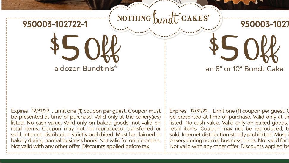 $5 OFF Any Purchase $30 or More One coupon per party. Not valid with other offers. Does not include specials. Expires 1-19-23. EXCLUDES ALCOHOL & BEVERAGES One coupon per party. Not valid with other offers. Does not include specials. Expires 1-19-23. EXCLUDES ALCOHOL & BEVERAGES One coupon per party. Not valid with other offers. Does not include specials. Expires 1-19-23. EXCLUDES ALCOHOL & BEVERAGES $3 OFF Any Purchase $20 or More $2 OFF Any Purchase $10 or More Starting December 1st Spend $50 in Gift Cards, Get $10 Gift Card for FREE! Any Purchase of $30 or more Not to be combined with any other offer. Expires 1/19/23 $5 OFF (330) 510-5801 Fairlawn, OH 44333 3900 Medina Rd, Unit I Fairlawn 10/31/22 NothingBundtCakes.com (330) 510-5801 Fairlawn, OH 44333 3900 Medina Rd, Unit I Fairlawn 10/31/22 NothingBundtCakes.com