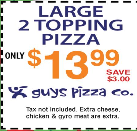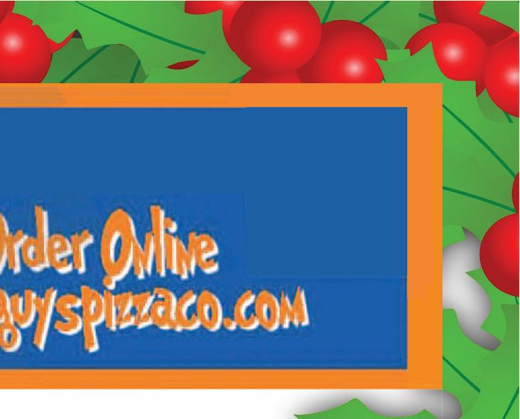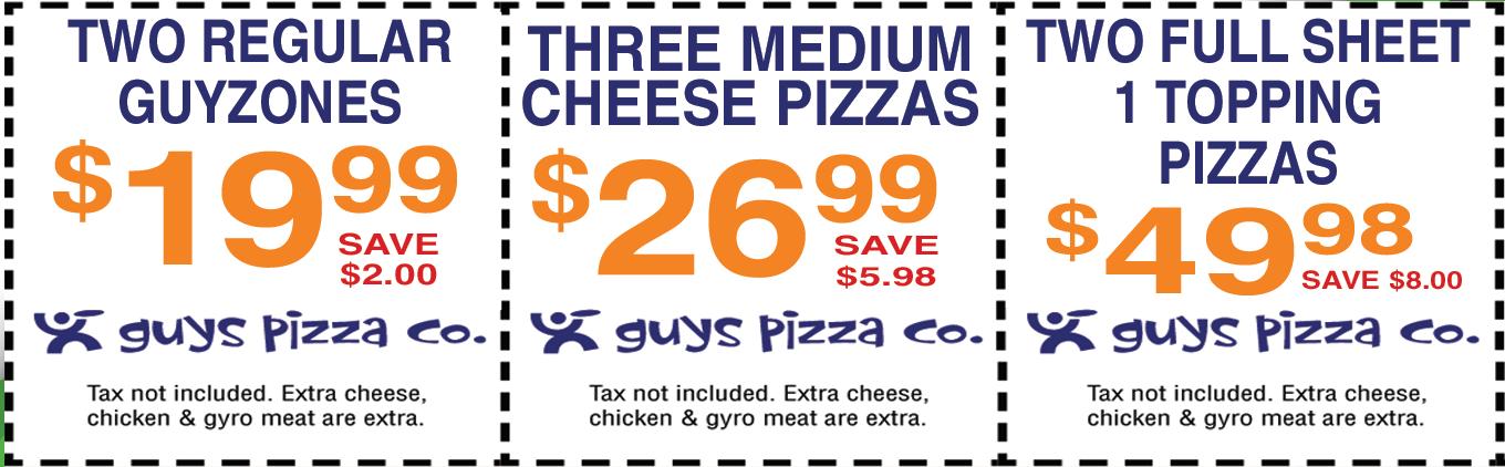 available in 12” only. Add $3.50 Note: Gluten Free Crust is prepared in a common kitchen with the risk of gluten exposure. Therefore, Guys Pizza Co. DOES for customers with Celiac disease. Customers with gluten sensitivities should exercise judgment in consuming this pizza. Small Medium Large Big Guy 1/2 Sheet Full Sheet 12.99 17.99 19.99 27.99 25.99 37.99 7.99 10.99 15.99 28.99 50¢ - 1.00 each