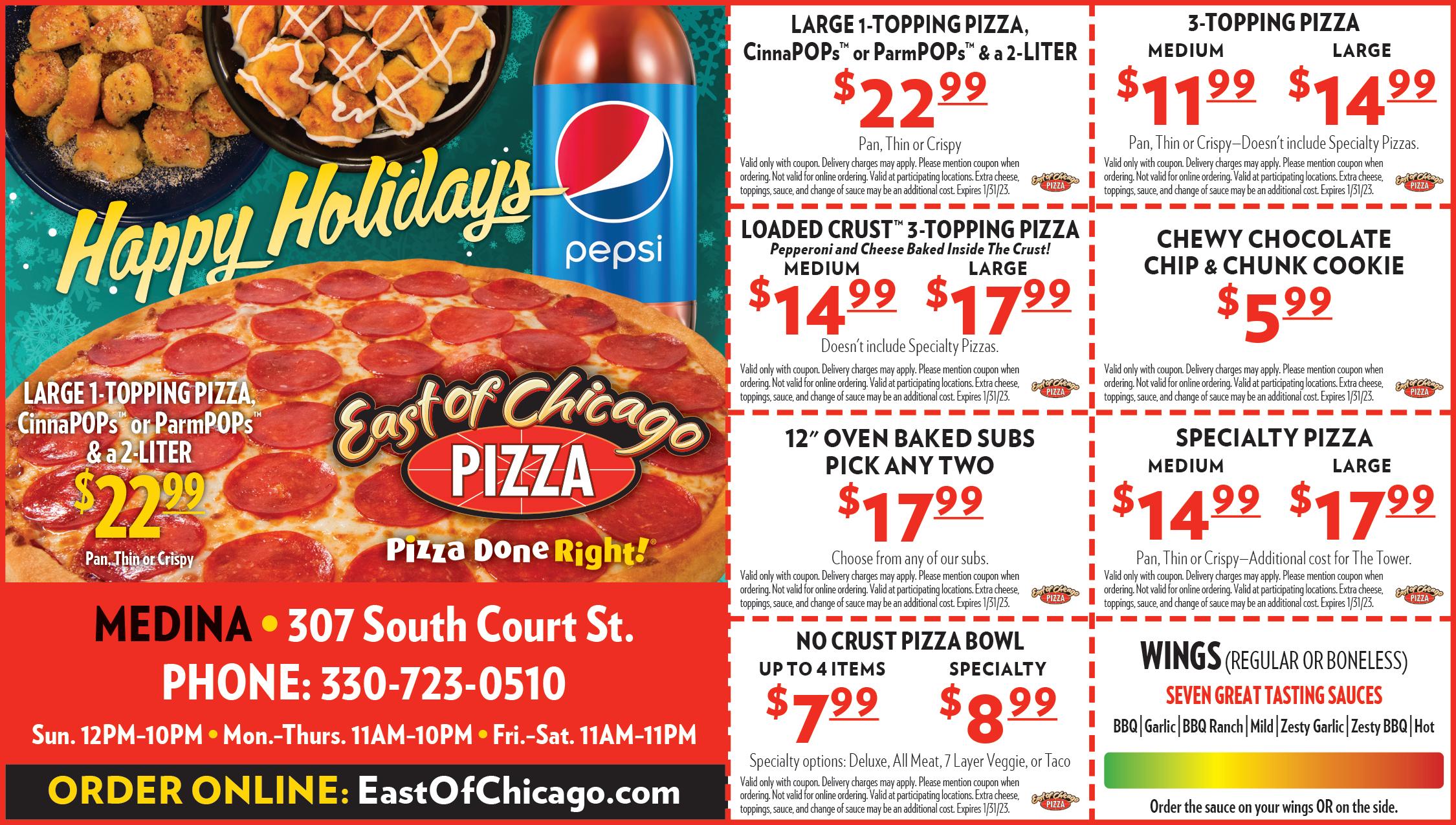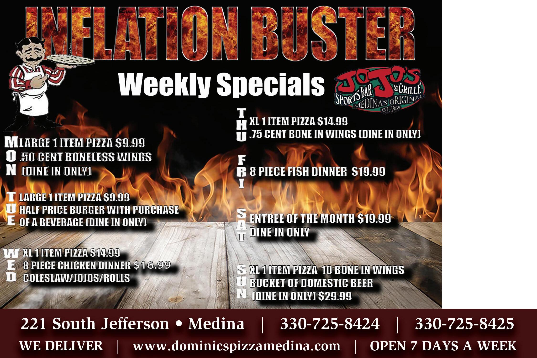 2777 Medina Rd Medina Ohio (Next to Jurassic Mountain) 330-572-4600 Full Menu at prehistoricpizzacompany.com Wed - Fri 4pm-9pm Sat 11am-9pm and Sun 11am-6pm Not valid with any other offer. Expires 1/19/23. Not valid with any other offer. Expires 1/19/23. Not valid with any other offer. Expires 1/19/23. Not valid with any other offer. Expires 1/19/23. Not valid with any other offer. Expires 1/19/23. 10 Pack Jurassic11.99Wings Hot, Mild, BBQ, Sweet Heat, Garlic Parmesan, Teriyaki Log Combo Box Mix of our Taco, Buffalo and Apple Logs 9.99 Any 6” Sub 5.99 Hot Italian, Ham and Cheese, Meatball Penne Pasta Meal 9.99 Includes Garlic Bread Add Meatball or Sausage $2 More Family Deal Large 1 Topping Pizza, 2 Liter Pop, 10 Wings & Log Combo Box 35.99 BODY SUGARING • SKINCARE • FACIALS ALL NATURAL HAIR REMOVAL FROM HEAD TO TOE Not to be combined with any other offer. Medina location only. Expires 1/19/23 $90 LUXURY FACIAL OXYGEN LIFT SERVICE REGULAR $120 SUGAR BAR 984 N. COURT ST • MEDINA 440-454-4665 www.medinasugarbar.com Online Booking Available!