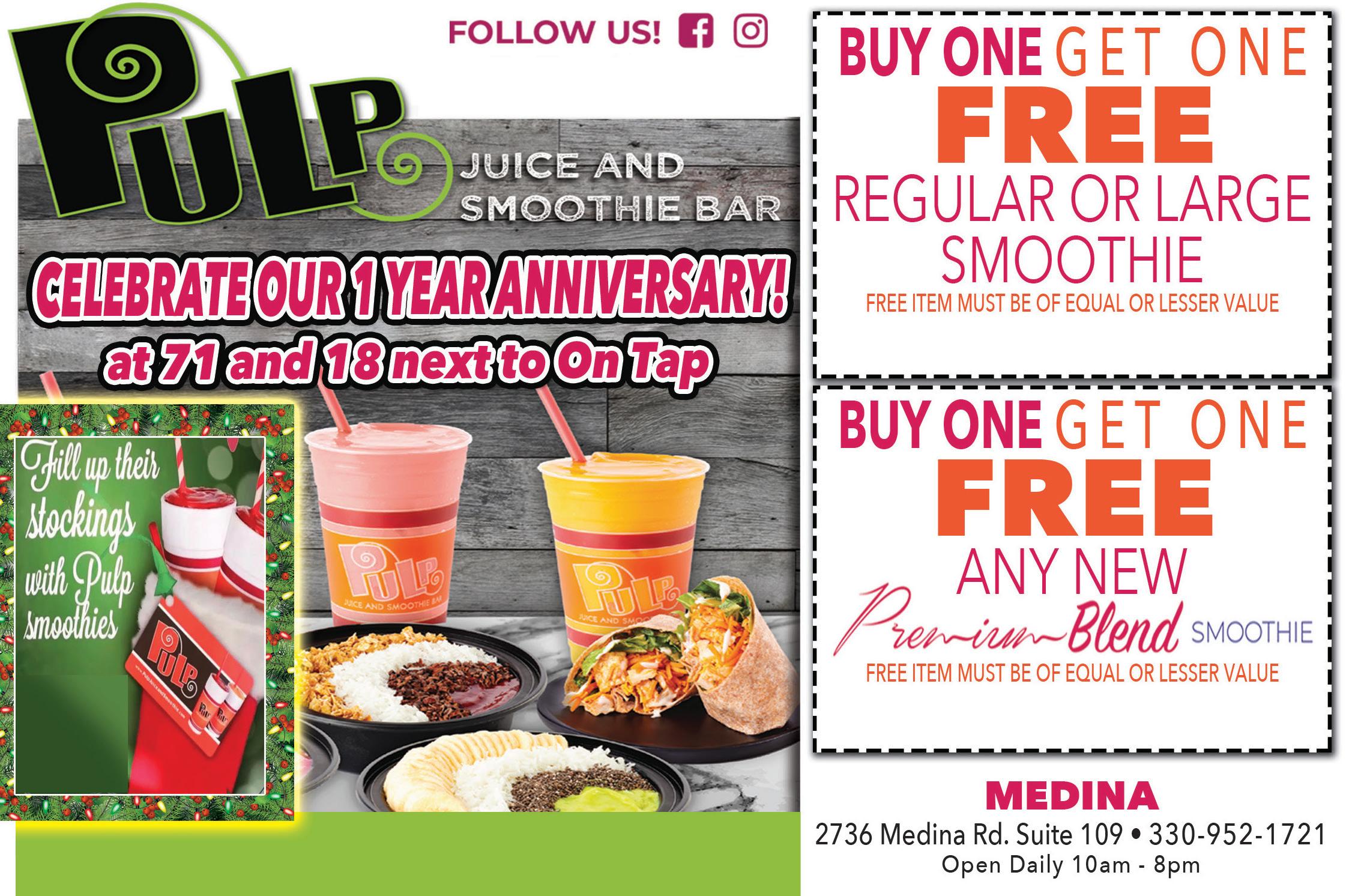 Breath Spray GIFT CERTIFICATES AVAILABLE Smoothies, Blended Bowls, Fresh Squeezed Juice, Wheatgrass & Ginger Shots, Wraps, Salads & more! PULPJUICEANDSMOOTHIE.COM Valid only at Medina Rd., Medina location. One coupon per customer per visit. Offers cannot be combined. Must present coupon at time of purchase. Expires 1-19-2023 Valid only at Medina Rd., Medina location. One coupon per customer per visit. Offers cannot be combined. Must present coupon at time of purchase. Expires 1-19-2023 NOW HIRING make great stocking stuffers. They’re also great for gift exchanges, co-workers or any Pulp fan! Available in any denomination.