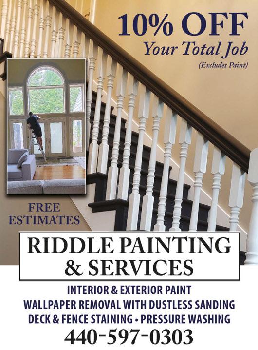 Offering Basement Waterproofing Solutions to Homeowners Across Northeast Ohio LICENSED & INSURED EXPERIENCED ASPHALT & PAVEMENT CONTRACTOR Residential & Commercial • Sealcoating Driveways & Parking Lots • Asphalt Paving Each IMPACT Paving employee is considered a paving expert. We will prepare & install your driveway or parking lot to be durable & pleasing to the eye. When it comes time for cleanup, we take away any old asphalt to be recycled, reducing the carbon footprint of your project. $500 OFF Any Paving Job Min. 2,000 sq ft Valid with TMS coupon only. Coupon must be presented at the time of estimate and may not be combined with other offer. Expires 6/15/23 Valid with TMS coupon only. Coupon must be presented at the time of estimate. Expires 6/15/23 Active & Retired AdditionalMilitary $500 OFF Any Paving Job 330-725-7408 330-225-7475 herbspaintinginc.com HERB’S PAINTING, INC ALUMINUM PAINT SPECIALISTS FREE ESTIMATES QUALITY WORK COMPETITIVE PRICES Aluminum or Wood Sided Houses SAVE $150.00 ON COMPLETE EXTERIOR PAINT JOB With This Coupon. Interior Paint Job 5% OFF On Any Service • Paint Walls/Ceilings • Paint/Stain Woodwork • Wallpaper Stripping • Patches & Repairs (3 Room Minimum) With This Coupon. WE STRIP WALLPAPER