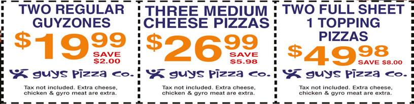 Small Medium Large Big Guy 1/2 Sheet Full Sheet 8” 12” 14” 20” 6 slices 8 slices 10 slices 12 slices 16 slices 32 slices Artichoke Hearts Bacon Banana Peppers Black Olives * Buffalo Chicken * Extra Cheese Fresh Mushrooms Green Peppers * Grilled Chicken * Gyro Meat Ham Italian Sausage Jalapeño Peppers Meatballs Pepperoni Pineapple Red Onions Roasted Red Pepper Salami Spicy Pepperoni Spinach Tomatoes Yellow Onions Cheese 7.9910.9912.9918.9916.9924.99 Toppings 1.25 1.502.003.003.004.00 *Premium Toppings 1.50 2.503.004.004.006.00 *Extra charge on all products for Premium Toppings Traditional or Thin Crust: Our Dough Is Made Fresh Daily! NOT recommend this pizza GLUTEN FREE CRUST available in 12” only. Add $3.50 Note: Gluten Free Crust is prepared in a common kitchen with the risk of gluten exposure. Therefore, Guys Pizza Co. DOES for customers with Celiac disease. Customers with gluten sensitivities should exercise judgment in consuming this pizza. Small Medium Large Big Guy 1/2 Sheet Full Sheet 12.99 17.99 19.99 27.99 25.99 37.99 7.99 10.99 15.99 28.99 50¢ - 1.00 each