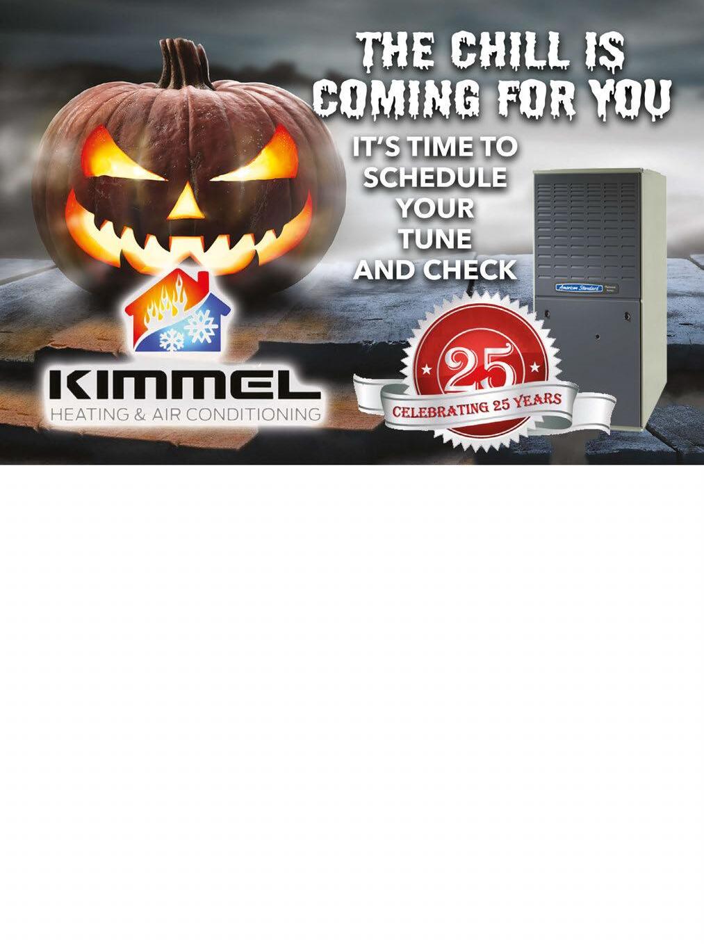 330-269-5671 License #15945 24 HOUR EMERGENCY SERVICE We Service All Makes & Models FURNACES – AIR CONDITIONERS – HUMIDIFIERS – HOT WATER TANKS – TANKLESS WATER HEATERS – HEAT PUMPS –AIR HANDLERS –BOILERS –TANKLESS BOILERS –THERMOSTATS –FILTERS –DIAGNOSTIC REPAIRS –WHOLE HOME AIR PURIFIERS –DUCT WORK – UV LIGHTS – MAINTENANCE PLANS – 24 HOUR EMERGENCY SERVICE – LOCAL FAMILY OWNED BUSINESSIN –25 YEARS IN BUSINESSFURNACES –AIR CONDITIONERS –HUMIDIFIERS –HOT WATER TANKS –TANKLESS WATER HEATERS –HEAT PUMPSFinancing Available* *Subject to credit approval, see store for details. www.kimmelheatingandair.com Residential, Commercial & New Construction Service Installation & Maintenance M Valid only during normal business hours. Cannot be combined with other offers. No additional discounts. Terms and conditions apply. Expires 11/10/2022 M Gas/Propane furnaces only, does not include boiler/oil furnaces. Valid only during normal business hours. Cannot be combined with other offers. No additional discounts. Terms and conditions apply. Expires 11/10/2022 $99 Tune & Check (regularly $129.00) $20 OFF New Customer $50 OFF Duct Cleaning & Tune Up (per furnace) M Valid only during normal business hours. Cannot be combined with other offers. No additional discounts. Terms and conditions apply. Expires 11/10/2022