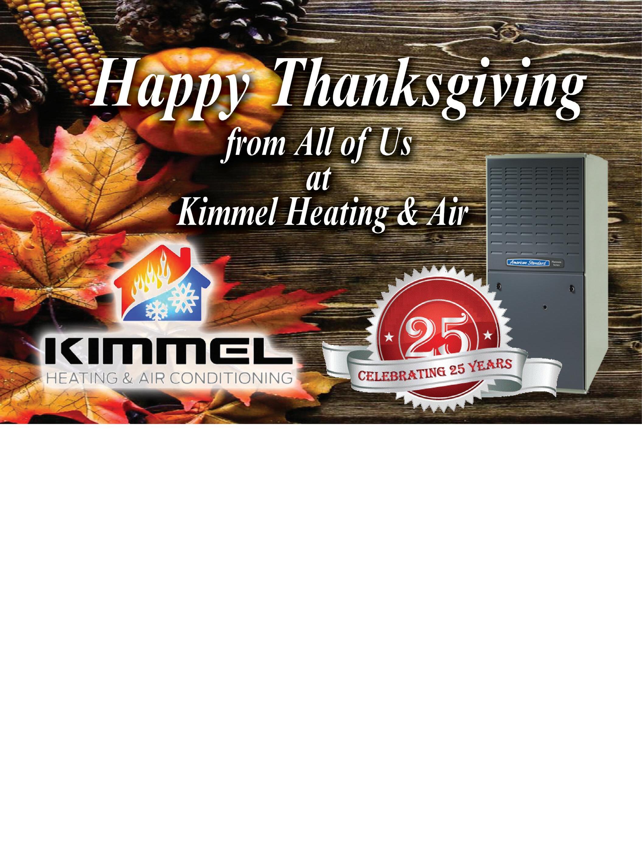 330-362-3905 License #15945 24 HOUR EMERGENCY SERVICE We Service All Makes & Models FURNACES – AIR CONDITIONERS – HUMIDIFIERS – HOT WATER TANKS – TANKLESS WATER HEATERS – HEAT PUMPS –AIR HANDLERS –BOILERS –TANKLESS BOILERS –THERMOSTATS –FILTERS –DIAGNOSTIC REPAIRS –WHOLE HOME AIR PURIFIERS –DUCT WORK – UV LIGHTS – MAINTENANCE PLANS – 24 HOUR EMERGENCY SERVICE – LOCAL FAMILY OWNED BUSINESSIN –25 YEARS IN BUSINESSFURNACES –AIR CONDITIONERS –HUMIDIFIERS –HOT WATER TANKS –TANKLESS WATER HEATERS –HEAT PUMPSFinancing Available* *Subject to credit approval, see store for details. www.kimmelheatingandair.com Residential, Commercial & New Construction Service Installation & Maintenance Valid only during normal business hours. Cannot be combined with other offers. No additional discounts. Terms and conditions apply. Expires 12/1/2022 Gas/Propane furnaces only, does not include boiler/oil furnaces. Valid only during normal business hours. Cannot be combined with other offers. No additional discounts. Terms and conditions apply. Expires 12/1/2022 $99 Tune & Check (regularly $129.00) $20 OFF New Customer $50 OFF Duct Cleaning & Tune Up (per furnace) Valid only during normal business hours. Cannot be combined with other offers. No additional discounts. Terms and conditions apply. Expires 12/1/2022 B/N B/N B/N