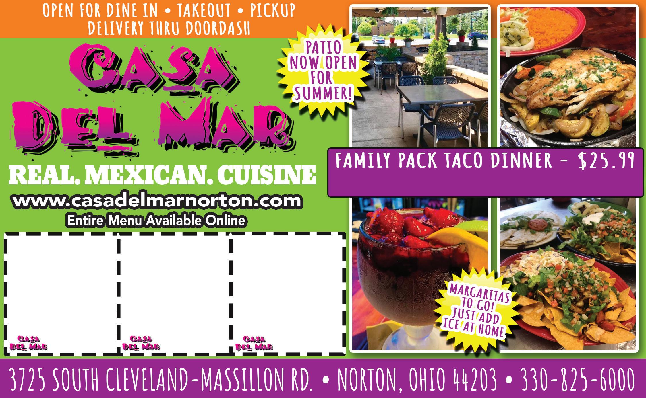 10 Tacos Beef or Chicken - Hard or Soft, Rice & Beans, Lettuce & Cheese, 2 Bags of Chips & 3 Salsas (Grilled Steak or Chicken $30) FAMILY PACK FAJITA DINNER (Feeds 4) Chicken $29.99 Steak $39.99 Shrimp $39.99 Includes Rice & Beans, Tortilla, Side of Lettuce & Sour Cream, 2 Large Chips & Large Salsa $3 OFF $25 or more dinner check 3725 South Cleveland-Massillon Rd, Norton Valid only with coupon. Not valid with any other 3725 South Cleveland-Massillon Rd, Norton Valid only with coupon. Not valid with any other SPEND $35 GET $5 OFF Mike Payne 330.808.1993 Dan Stroup 330.354.5833 1656 Ridgecliff Circle NE, Canton, OH 44721 159 37th Street SW Barberton, OH 44203 4589 Rex Lake Drive, New Franklin, OH 44319 SOLD SOLD WATERFRONT
