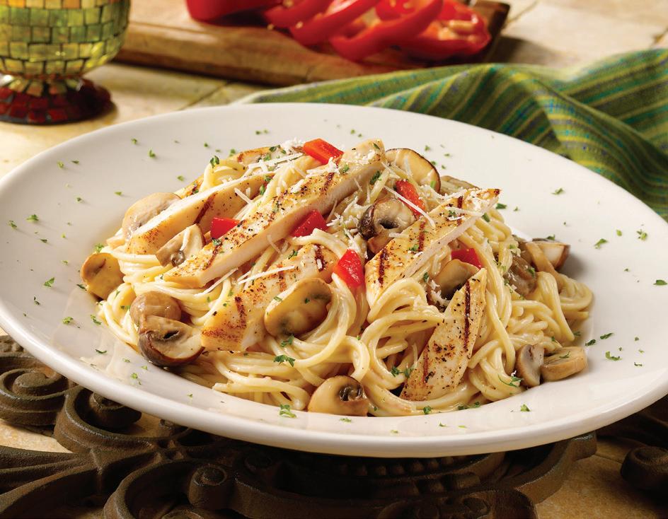 Creamy sauce over a trio of fresh mushrooms tossed with spaghetti and artichoke hearts topped with grilled chicken breast and roasted red bell peppers.