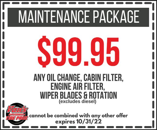 BARBERTON • NORTON To advertise, call 330.350.2089 September 2022 Shop local. Drive less. Save more. Family Owned & Operated Valid with coupon. Expires 9/29/22. Valid with coupon. Expires 9/29/22. EXCULDES 1234YR. Valid with coupon. Expires 9/29/22. LUBE, OIL AND FILTER $2995 Up to 5 quarts of Oil Valid with coupon. Expires 9/29/22. BRAKE JOB SPECIAL $40 OFF ANY BRAKE JOB Valid with coupon. Expires 9/29/22. $8995 Valid with coupon. Expires 9/29/22. ALL SEASON WIPER BLADES Two Installed for $3995 Plus Tax FULL SYNTHETIC OIL CHANGE $5995 Up to 5 quarts of Oil Plus Tax AIR CONDITIONING TUNE-UP $5995 Includes up to 2 lbs R134A Plus Tax Starting At 9923 Banque s Ca ering Too! $5 is Waiting for You at hopocangardens.com Mondays 11am-9pm $1095 Classic 4pc Dinner All Day. Dine-In or Carry-out. Good any day. Dine-in or carry-out. Not valid with Monday $10.95 specials. Not valid with other offers or discounts. Expires 9/29/22 Buy 2 Classic 4pc Chicken Dinners, Get 3rd Classic 4pc FREE 825-9923 Banquets & Catering Too!