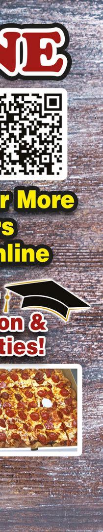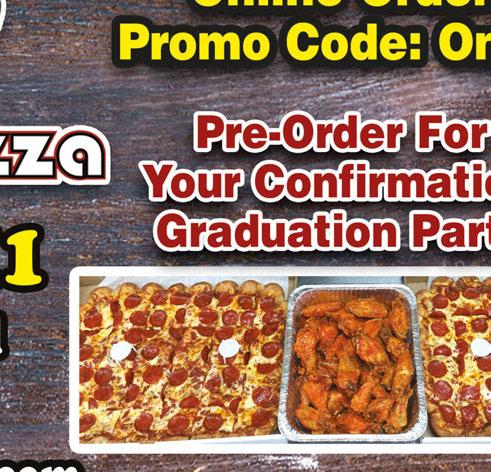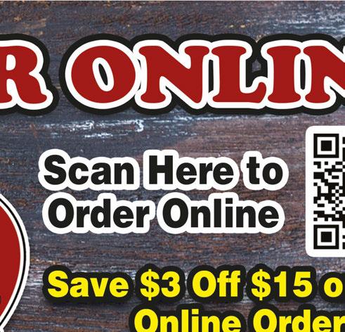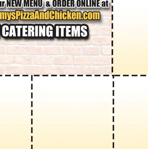 Expires 5/31/24 Pizza & Chicken Combo • 12” Medium 8 Slice 2-Topping Pizza • 8 pc. Chicken • 15 Jo-Jo Potatoes w/Ranch • 12 oz. Coleslaw • Rolls & Honey Butter $2999 Full Sheet 1-Topping Pizza PLUS 25 pc. Chicken $6995 Add 50 Jo-Jo’s for $15 The Party Pack • 50 Pieces of Chicken • 75 Jo-Jo Potatoes • Full Sheet 1-Topping Pizza • Full Pan of Rigatoni • Full Pan of Salad (Dressing not included) Serves 30-40 Add 40 Meatballs for $20 $23995 Small Party Pack • 25 Pieces of Chicken • 50 Jo-Jo Potatoes • 1/2 Pan Salad (Dressing not included) • 1/2 Pan Rigatoni • Full Sheet 1-Topping Pizza Add 20 Meatballs for $10 $16995 Mini Party Pack • 16 Pieces of Chicken • 30 Bone-in Wings OR 50 Boneless Wings • Full Sheet 1-Topping Pizza $9995 Stuffed Cabbage Pulled Pork Sliders, Ham, Roast Beef, Turkey with Gravy, Fettuccine Alfredo with Chicken Mac-N-Cheese, Cheesy Potatoes Expires 5/31/24 Expires 5/31/24 Expires 5/31/24 Expires 5/31/24 Expires 5/31/24 Expires 5/31/24 Expires 5/31/24 Expires 5/31/24 Expires 5/31/24 Expires 5/31/24 Expires 5/31/24 Expires 5/31/24 Expires 5/31/24 Large 16” 2-Topping Pizza $1499 8pc Chicken 8 Jo-Jo’s $1499 2 Breasts, 2 Thighs, 2 Wings, 2 Legs NO SUBSTITUTIONS 2 Medium 1-Topping Pizzas $1999 Pizza & Wing Combo Medium 1-Topping Pizza PLUS 10 Wings (Bone-In or Boneless) $1999 Add celery & blue cheese or ranch $2.99 14” Meatball Sub $10 Crazy 12 • 12 pc. Chicken • 12 Jo-Jo Potatoes • 12 oz. Coleslaw $2599 3 Breasts, 3 Thighs, 3 Wings, 3 Legs NO SUBSTITUTIONS Full Sheet 1-Topping Pizza $2995 35 Squares 2 Bowls of Soup $10 9 Flavors to Choose From $5 BUCK 4 pc 1 Breast, 1 Thigh, 1 Wing, 1 Leg NO SUBSTITUTIONS