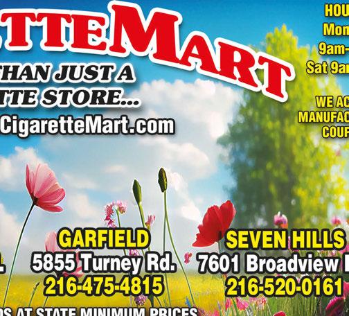 STRONGSVILLE Published By Town Money Saver, Inc. Corporate Office • PO Box 356 • Lucas, OH 44843 © 2024 TMS Franchising, Inc. All rights reserved. For advertising information, call 330-350-2089 NEXT ISSUE IN HOMES: May 16, 2024 ADVERTISING DEADLINE: May 1, 2024 PRSRT STD ECRWSS U.S. POSTAGE PAID Town Money Saver, Inc. townmoneysaver.com WE PRICE MATCH! BUY ONE GET ONE 50% OFF ALL THC DISPOSABLES, CARTS, FLOWER AND EDIBLES MUST BE ENROLLED IN REWARDS PROGRAM. ONE COUPON PER PERSON. MUST PRESENT COUPON TO SALES REP BEFORE PURCHASE TO CLAIM. NOT VALID WITH ANY OTHER OFFERS OR DISCOUNTS. EXPIRES 5/15/24 13517 W. 130th St. North Royalton (440) 652-9040 5620 Wallings Rd. North Royalton (440) 628-9225 Over 1000 flavors of disposables and ejuice! If we don’t have it we will get it! NEW 4223 E. Royalton Rd. Broadview Heights (440) 630-9331 OPEN 7 DAYS A WEEK! 15315 Pearl Rd. • Strongsville 440-268-6233 Online Ordering Available www.ricostacosmex.com $3.00 OFF Purchase of 2 Lunches & 2 Drinks Valid with coupon. One coupon per table. Not valid with any other o er. Expires 5/16/24. $5.00 OFF Order of $35 or More Valid with coupon. One coupon per table. Not valid with any other o er. Expires 5/16/24. $10.00 OFF Order of $60 or More Valid with coupon. One coupon per table. Not valid with any other o er. Expires 5/16/24.