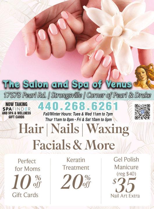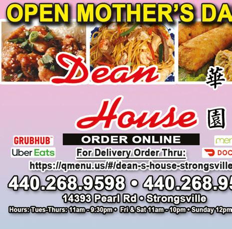 *Restrictions may apply. Offer valid in-Retreat only. See locations for details. Offer available April 8-June 30 while supplies last. Service times include up to 10 minutes of prep time. Each Massage Heights Retreat is independently owned and operated. Franchise opportunities available. ©2024. SWG IP, LLC. All Rights Reserved. Mother’s Day Package $155 90-Minute Massage with Rose Foot Scrub & Hot Stone Therapy + Free 1-Hour Service with Package Purchase* The Greens at Strongsville 440.580.4520 18240 Royalton Rd. Strongsville, OH 44136 CARRYOUT • ORDER ONLINE: DRAGONSTRONGSVILLE.COM We use 100% Vegetable Oil CLOSED TUESDAYS FREE General Tso’s or Sweet & Sour Chicken with order of $60 or more Valid with coupon. Not to be combined with any other offer. EXPIRES 5/16/24 Valid with coupon. Not to be combined with any other offer. EXPIRES 5/16/24 Valid with coupon. Not to be combined with any other offer. EXPIRES 5/16/24 FREE Order of Chicken Lo Mein or Pork Fried Rice with order of $50 or more FREE Order of (2) Egg Rolls or Wonton Soup with order of $20 or more 10% OFF Any Order (Cash Only) Valid with coupon. Not to be combined with any other offer. EXPIRES 5/16/24 440.238.8278 440.238.8408 20906 Drake Rd • Strongsville, 44149 (Corner of Drake & Prospect) Open 6 Days a Week Mon, Wed & Thur: 11am - 9:30pm Fri & Sat 11am - 10pm • Sun: 1pm - 9:30pm OPEN MOTHER’S DAY!