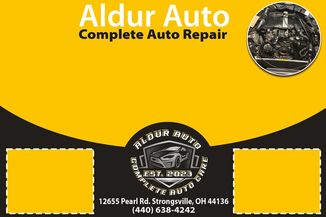 www.aldurauto.com We Offer Complete Auto Repairs That are Honest, Trustworthy and Prices are Competitive! • OIL CHANGES • BRAKE SERVICES • TIRE REPAIRS AND REPLACEMENTS • ENGINE REPAIRS • HVAC REPAIRS • TRANSMISSION REPAIRS • ALIGNMENTS • SUSPENSION REPAIRS • MAINTENACE SERVICES • ELECTRICAL DIAGNOSTICS AND REPAIRS • OHIO E-CHECK REPAIRS • AND MUCH MORE STRONGSVILLE AREA WE ARE OPEN MON-FRI 8AM TO 5PM SAT 8AM-1PM Police, Fire, EMTs, Medical Personnel, Teachers, Students, Military & Veterans BRING IN YOUR ID OR BADGE FOR 10% OFF Call Today for a FREE A/C System Check! BRING THIS COUPON INTO ALDUR AUTO FOR 10% OFF REPAIRS $199.99 OR HIGHER BRING THIS COUPON INTO ALDUR AUTO FOR 15% OFF REPAIRS $299.99 OR HIGHER Free Estimates 440-237-2251 Residential & Commercial Bonded / Insured / Over 25 Years Experience Cannot be combined with any other offer. Must present coupon. Expires 5-16-24 Cannot be combined with any other offer. Must present coupon. Expires 5-16-24 Cannot be combined with any other offer. Must present coupon. Expires 5-16-24