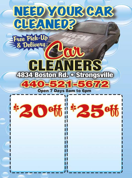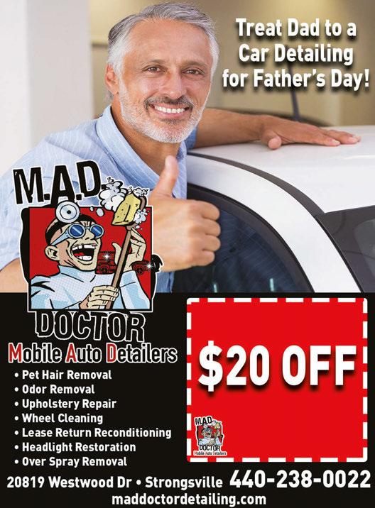 Valid only with TMS coupon. Not valid with any other offer. Expires 7/13/23 Valid only with TMS coupon. Not valid with any other offer. Expires 7/13/23 • Apply Tarminator to Remove Bugs, Tar, Sap, Grease From Exterior • Clay Bar to Remove Road Debris • Apply Zep Autoglaze High Gloss Polish • Wheels Detailed/Tires Dressed • Apply All-Purpose Cleaner to Interior • Formula 90 Biosolve Clean All Upholstery & Carpet • Windows & Mirrors Cleaned • Apply Tarminator to Remove Bugs, Tar, Sap, Grease From Exterior • Clay Bar to Remove Road Debris • Apply Zep Fallout Remover • Apply Zep Autoglaze High Gloss Polish • Apply Zep Deep Shine Wax • Apply All-Purpose Cleaner to Interior • Steam Clean or Formula 90 Biosolve Clean All Upholstery & Carpet • Windows & Mirrors Cleaned Reg. $200 Reg. $250 BASIC IN & OUT THE G.O.A.T. NOW $180 NOW $225 Valid with coupon. Expires 7/13/23 Same management as Don Ramon Strongsville 18737 Royalton Rd. 440-846-2313 ONLINE ORDERING NEW DELIVERY Visit donramon-granfiestamex.com for other locations & menu Visit donramon-granfiestamex.com for other locations & menu Go To donramon-granfiestamex.com & Select Delivery or Pick-Up Gran Fiesta Mex Strongsville $400 OFF Any Purchase of $20 or More (Tax Not Included) DINE IN ONLY. Valid at all locations listed. One coupon per table per party. Not valid w/any other offers or special of the day. Not valid on alcohol. Exp 7-13-23 $600 OFF Any Purchase of $30 or More (Tax Not Included) DINE IN ONLY. Valid at all locations listed. One coupon per table per party. Not valid w/any other offers or special of the day. Not valid on alcohol. Exp 7-13-23 $1000 OFF Any Purchase of $50 or More (Tax Not Included) DINE IN ONLY. Valid at all locations listed. One coupon per table per party. Not valid w/any other offers or special of the day. Not valid on alcohol. Exp 7-13-23 Sunday, June 18th Buy Any 2 Meals & 2 Beverages, Father’s Receive a $10 Gift Certificate Drink Specials AllLongDay S S S
