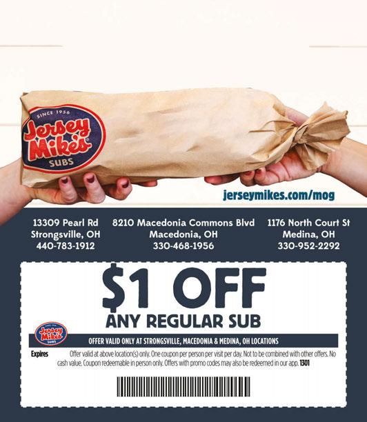 $75 $55 $45 WWW.SPECIALTOUCHCLEANERS.COM 330-922-4780 12465 Pearl Rd Strongsville (In Staples Plaza) 440-238-8811 $650 REG. SANDWICH Make it a Meal for $3.80 more + tax Extra for BTE Valid only at 12465 Pearl Rd. Strongsville. Not valid with any other offers or online orders. Expires 7/13/23. $850 MED. SANDWICH Make it a Meal for $3.80 more + tax $18 00 ANY 2 REG. SANDWICHES & 2 REG. POTATO WAFFERS® Extra for BTE Valid only at 12465 Pearl Rd. Strongsville. Not valid with any other offers or online orders. Expires 7/13/23. Extra for BTE Valid only at 12465 Pearl Rd. Strongsville. Not valid with any other offers or online orders. Expires 7/13/23. 10% OFF Any Services Valid with coupon. Expires 7/13/23