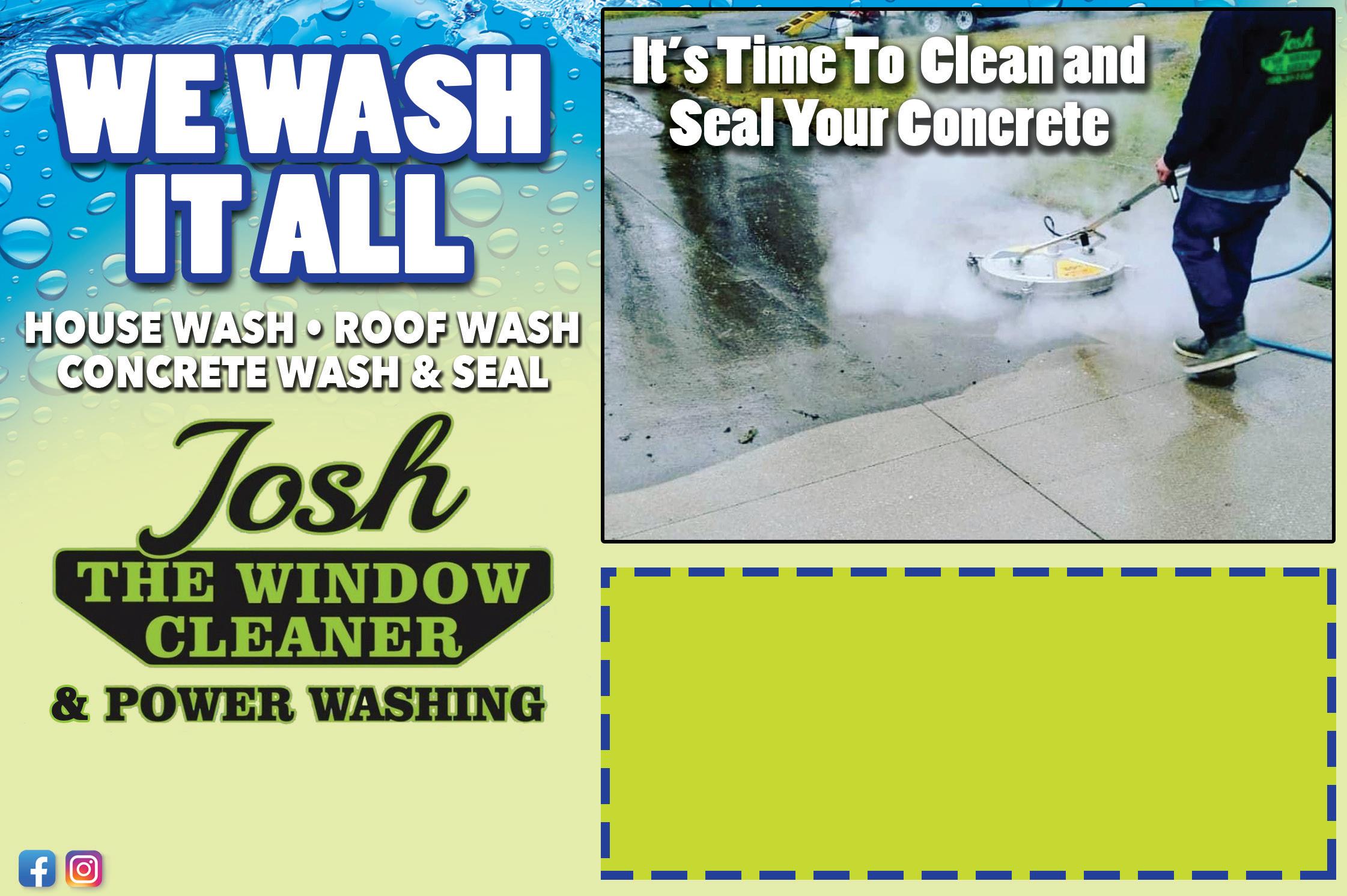 330-808-1048 www.joshthewindowcleaner.net Summ Special 15% Off All Services Josh The Window Cleaner 330-808-1048. Minimum purchase may apply. With this coupon. Not valid with other offers. Expires 9/1/22. “Just had my driveway done by Josh the Window Cleaner. The job turned out perfectly. My driveway never looked better except for the day that it was poured”.....Harry C. Veteran Owned and Operated